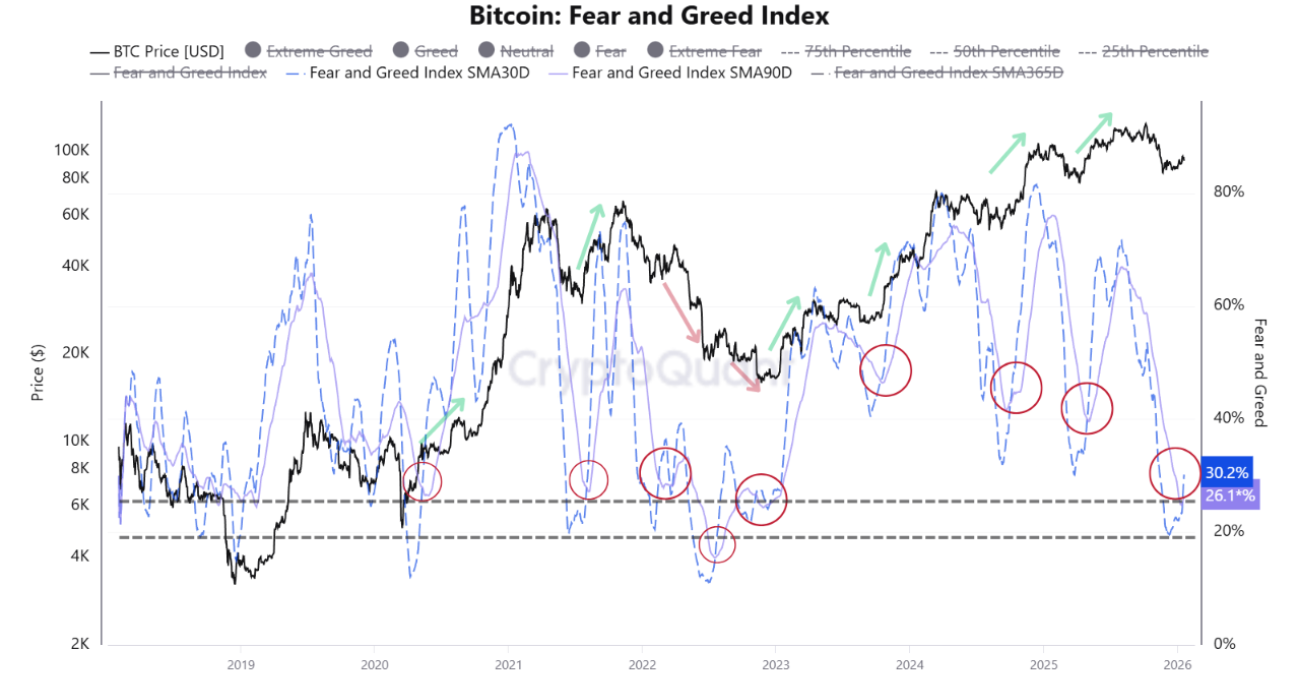 “Históricamente, estos cruces tienden a producirse después de fases prolongadas de miedo, a menudo cerca de zonas de compresión de precios locales en lugar de máximos importantes. En la mayoría de los casos destacados en el gráfico, el precio responde positivamente en las semanas siguientes.”