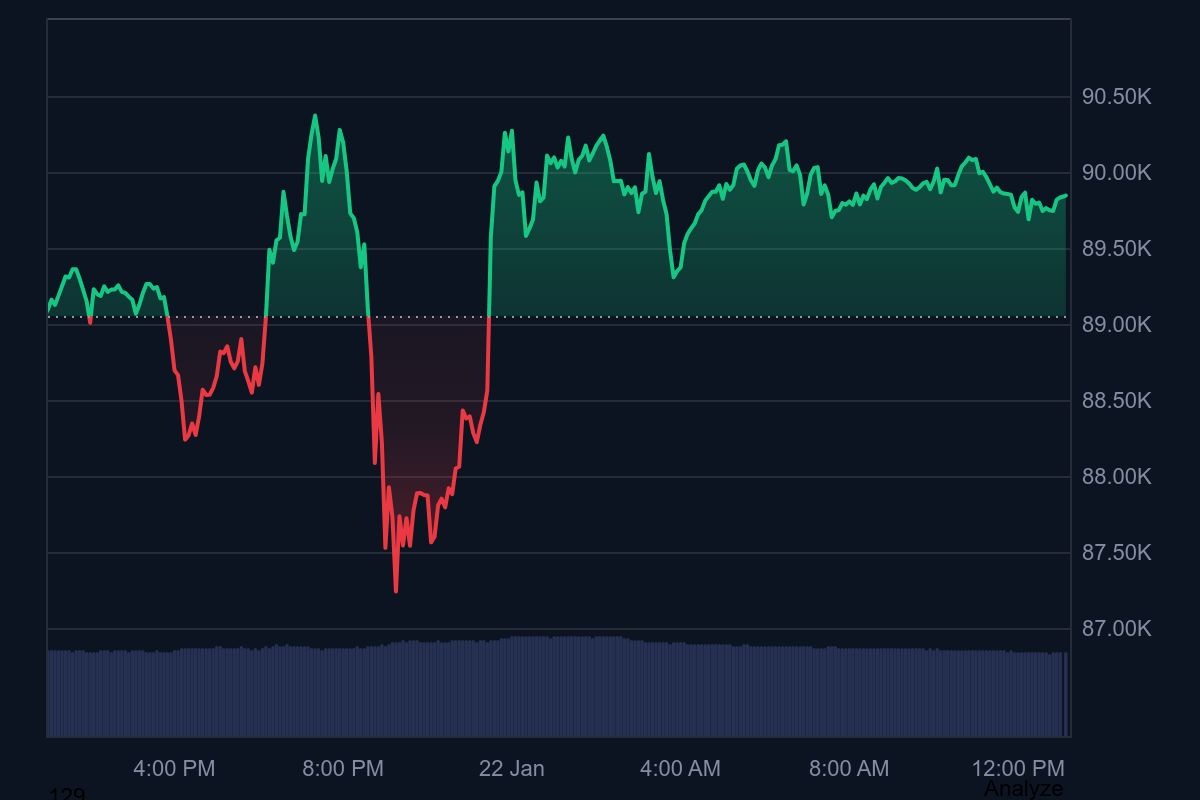 De hecho, se marchó de Davos con un supuesto "marco para un futuro acuerdo". Bitcoin (BTC) respondió positivamente a la noticia, subiendo de unos USD 87.000 a USD 90.000 al final de la tarde.