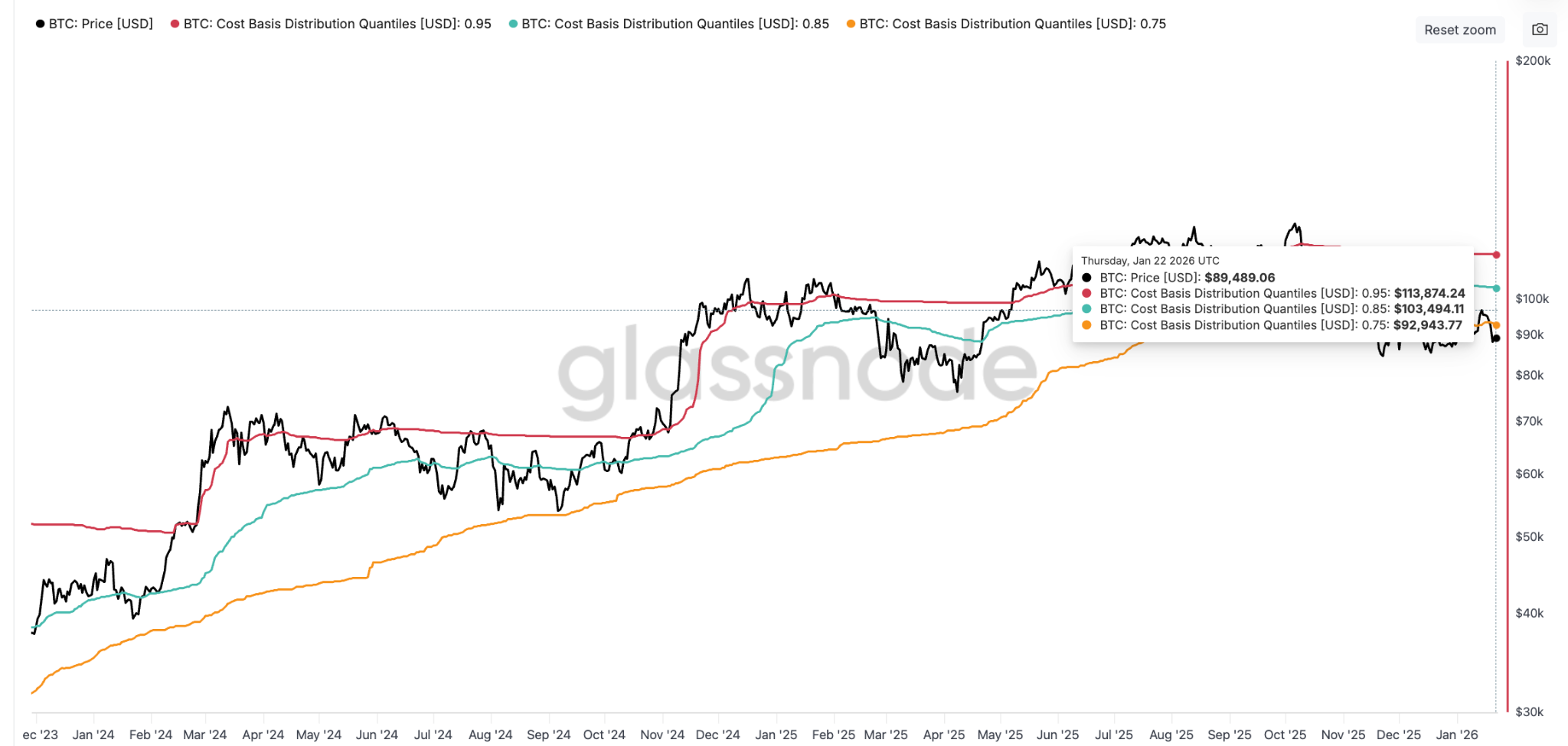 Como resultado, Bitcoin perdió niveles clave de soporte, incluyendo la base de costo del percentil 75, actualmente en 92.940 dólares.