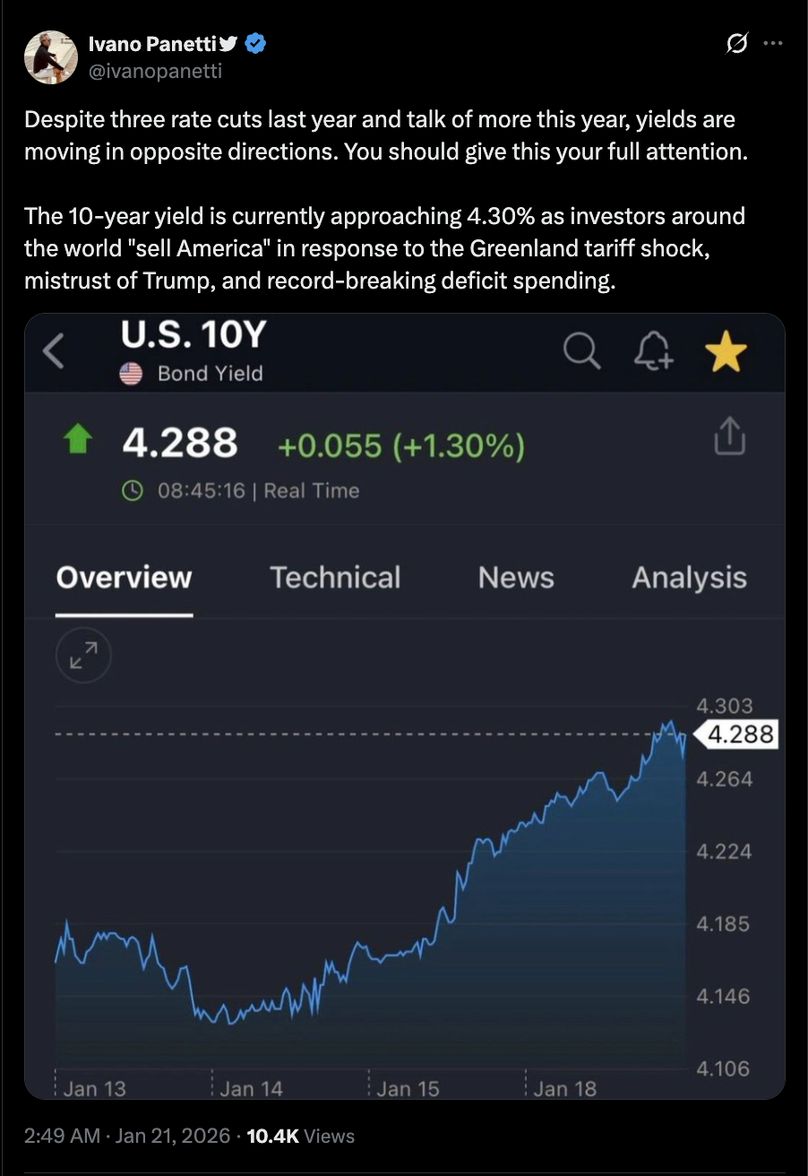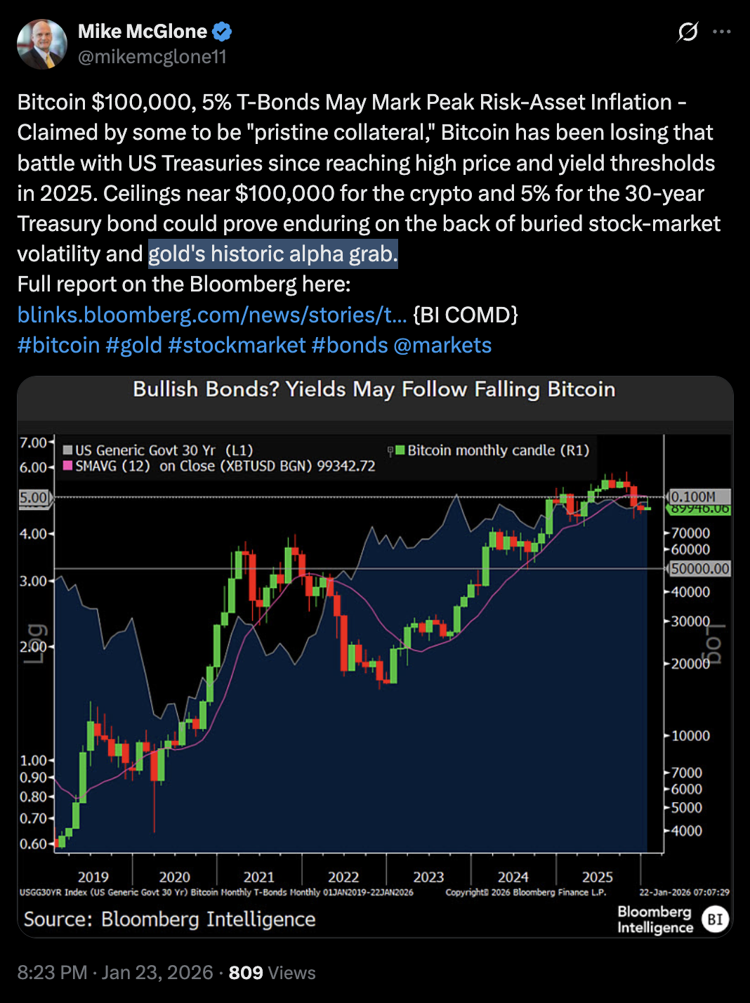 En una publicación del 23 de enero, McGlone argumentó que la "histórica ganancia alfa" del oro está atrayendo capital hacia la cobertura tradicional contra la inflación, en un momento en el que los rendimientos más altos de los bonos del Tesoro a largo plazo también compiten por los flujos.