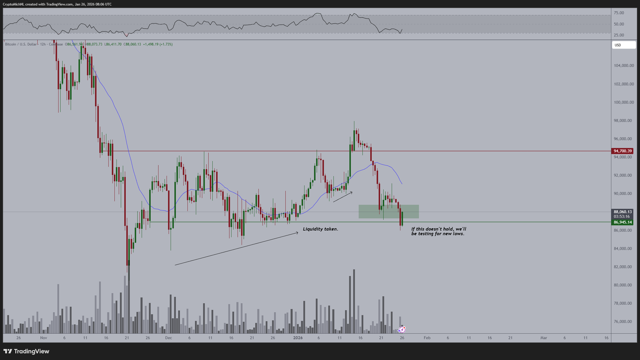 Para van de Poppe, en este tipo de movimientos, grandes actores empujan el precio por debajo de mínimos locales para activar stop-loss y, posteriormente, comprar a mejores precios, lo que genera rebotes rápidos —como el observado cerca de los 86,000 dólares— y condiciones para un nuevo impulso alcista.