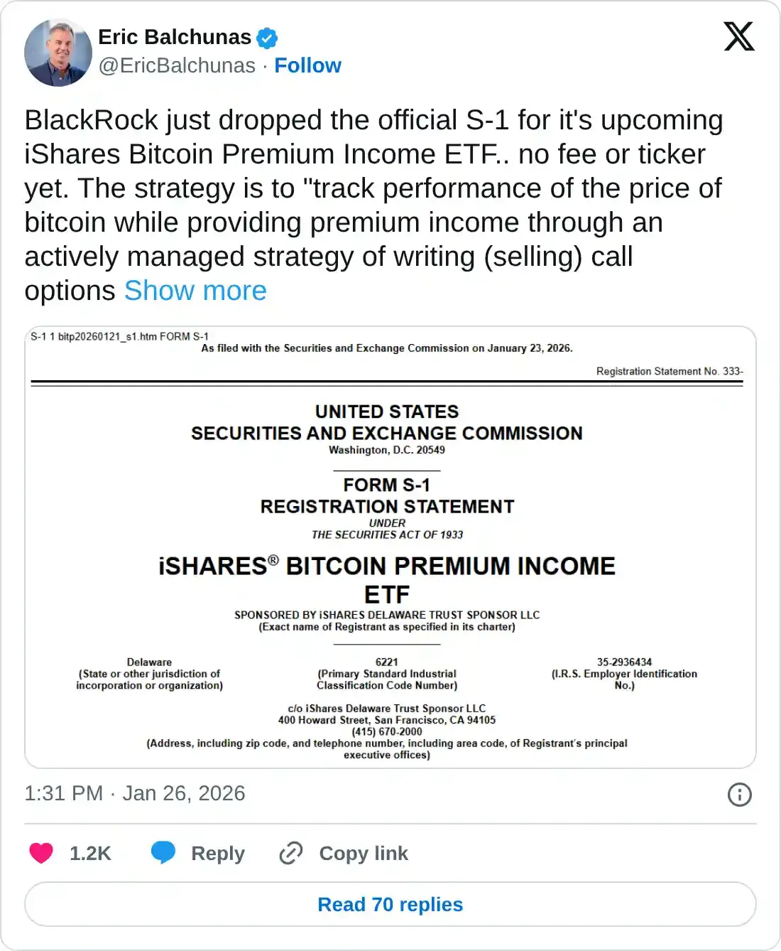 Para capitalizar la volatilidad del Bitcoin, BlackRock presentó un formulario S-1 para el ETF de Ingresos Premium de iShares Bitcoin el lunes, sin finalizar el código de ticker o las tarifas. El nuevo ETF ofrecerá exposición al Bitcoin mientras también genera rendimiento al escribir activamente opciones de compra sobre el iShares Bitcoin Trust (IBIT), que está valorado en más de 68.000 millones de dólares.
