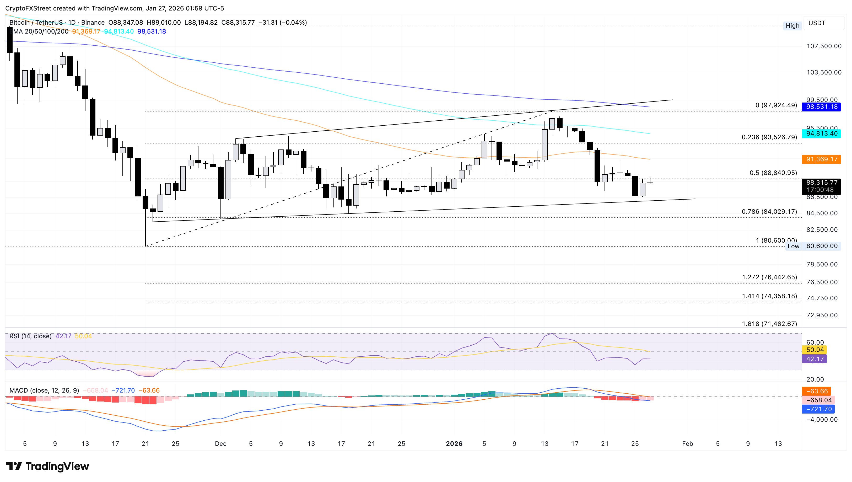 El Bitcoin cotiza por debajo de las medias móviles exponenciales (EMAs) de 50 días, 100 días y 200 días, reflejando un tono bajista más amplio. La principal criptomoneda lucha por superar el nivel de retroceso de Fibonacci del 50% en 88.840$, medido desde el mínimo del 21 de noviembre en 80.600$ hasta el máximo del 14 de enero en 97.924.
