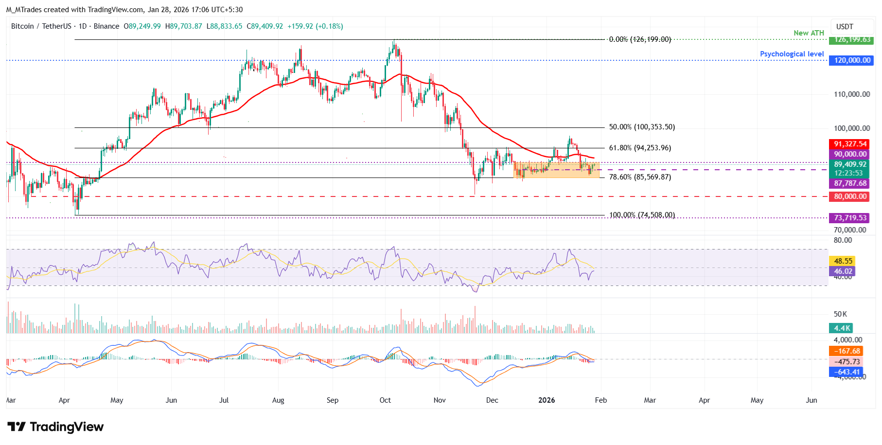 Si los 87.787$ continúan manteniéndose como soporte, el $BTC podría extender el rally hacia el límite superior del patrón horizontal en 90.000$. Un cierre por encima de este nivel podría extender las ganancias hacia la media móvil exponencial (EMA) de 50 días en 91.327$.