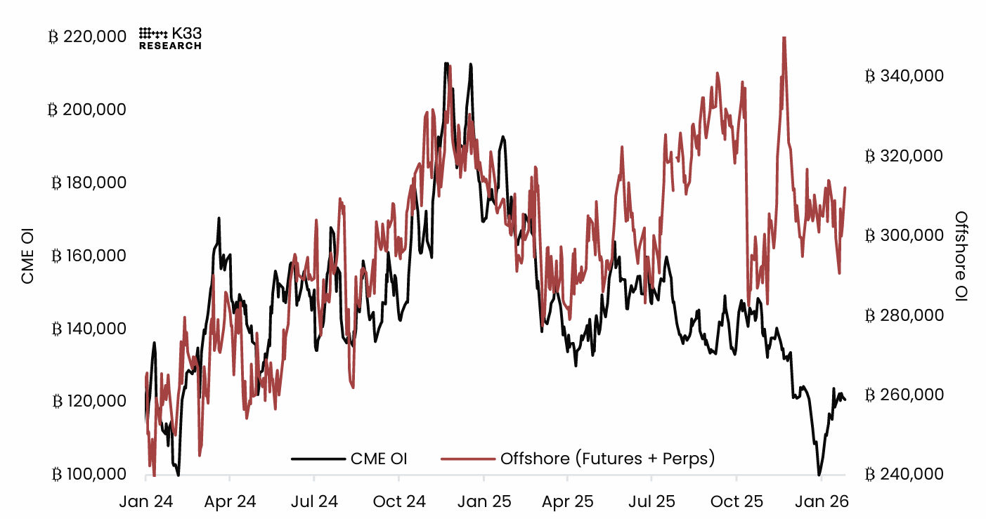 Mientras ambos mercados muestran una participación reducida, el Interés Abierto (OI) de CME ha estado en una tendencia a la baja constante durante el último año y ha disminuido aproximadamente un 50% desde su pico de diciembre de 2024, en contraste con los perpetuos offshore, donde el apalancamiento se ha estabilizado por encima de los mínimos de principios de 2025. "Esto puede atribuirse en parte a la creciente popularidad institucional de las opciones de ETF de $BTC para cobertura y construcción de estrategias, reduciendo parte de la cuota de mercado casi monopolística de CME en derivados disfrutada antes de la aprobación de las opciones de ETF. En segundo lugar, una demanda sostenida reducida de exposición apalancada a $BTC a través de ETFs de $BTC largos apalancados 2x ha debilitado aún más la dominancia de OI de CME durante el último año", señaló el analista de K33.