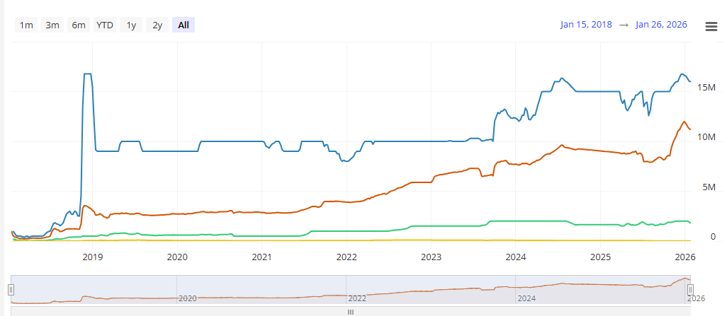 El impulso detrás de este crecimiento no es fortuito. A enero de 2026, la capacidad pública total de la Lightning Network oscila entre los 5.600 y 5.637 $BTC, lo que equivale a unos 490 a 510 millones de dólares, según datos de Bitcoin Visuals. Este pico reciente revierte años de estancamiento, gracias en parte a las inyecciones de liquidez provenientes de grandes exchanges como Binance y OKX.
