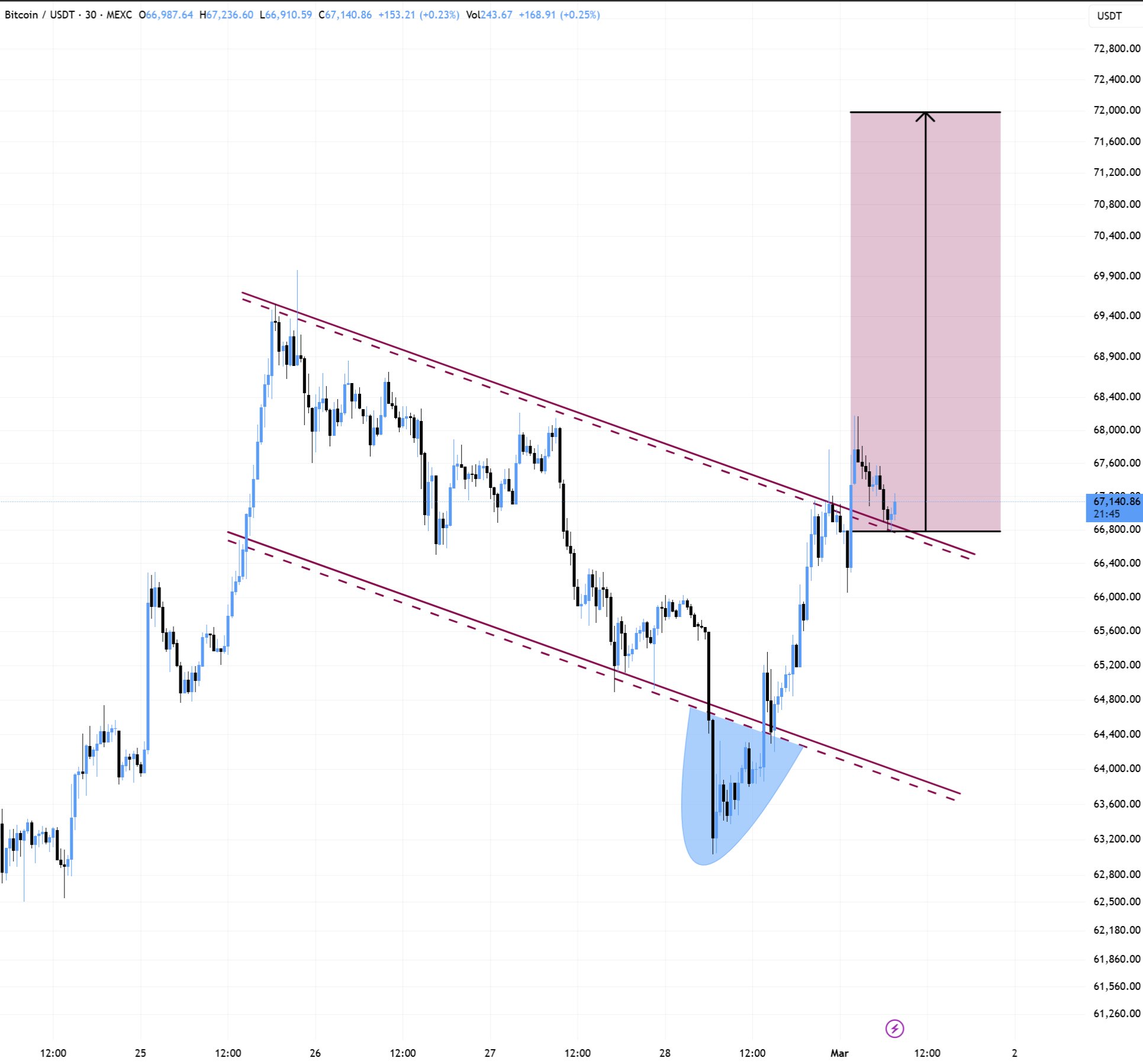 Comerciante ve un repunte del precio de $BTC hacia los 74.000 dólares