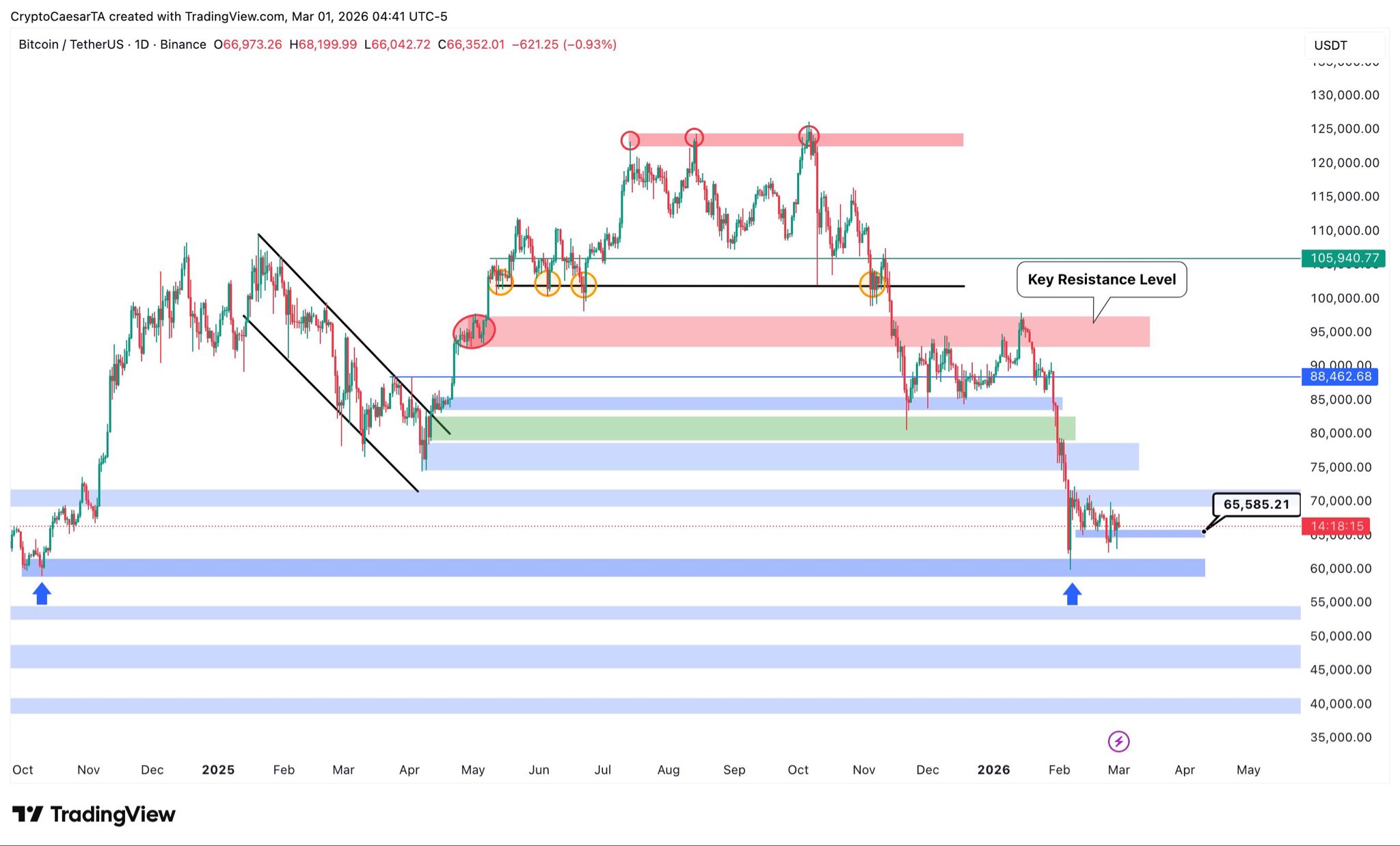 Van de Poppe se refirió a la media móvil simple de 21 días de Bitcoin en 67.627 dólares. La "brecha" del fin de semana en el mercado de futuros de Bitcoin de CME Group se situó a la baja en 65.880 dólares.