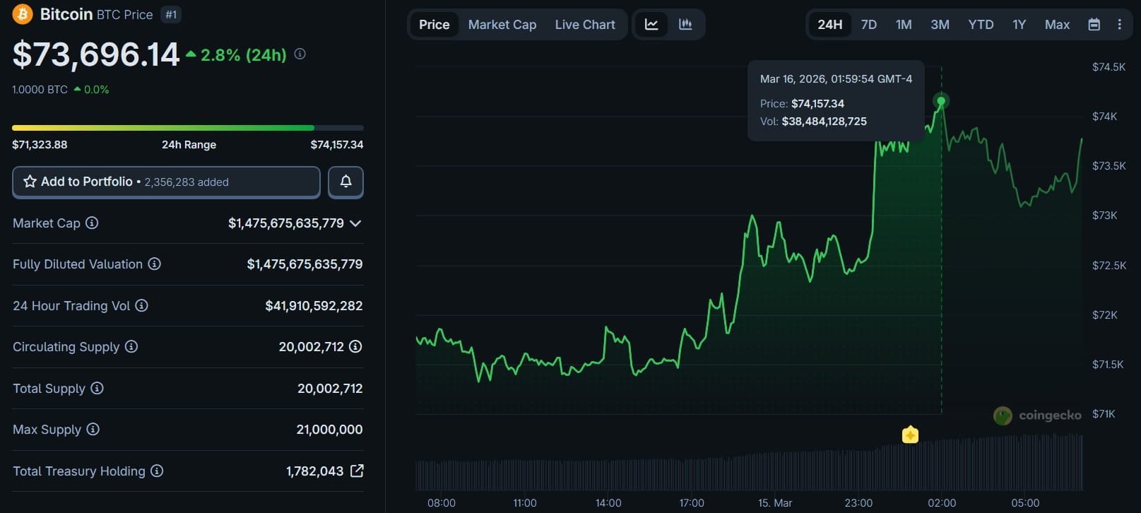Los datos de CoinGecko muestran que $BTC alcanzó un máximo local de USD $74.157 en las primeras horas de la madrugada (ET) antes de restar ligeramente las ganancias.
