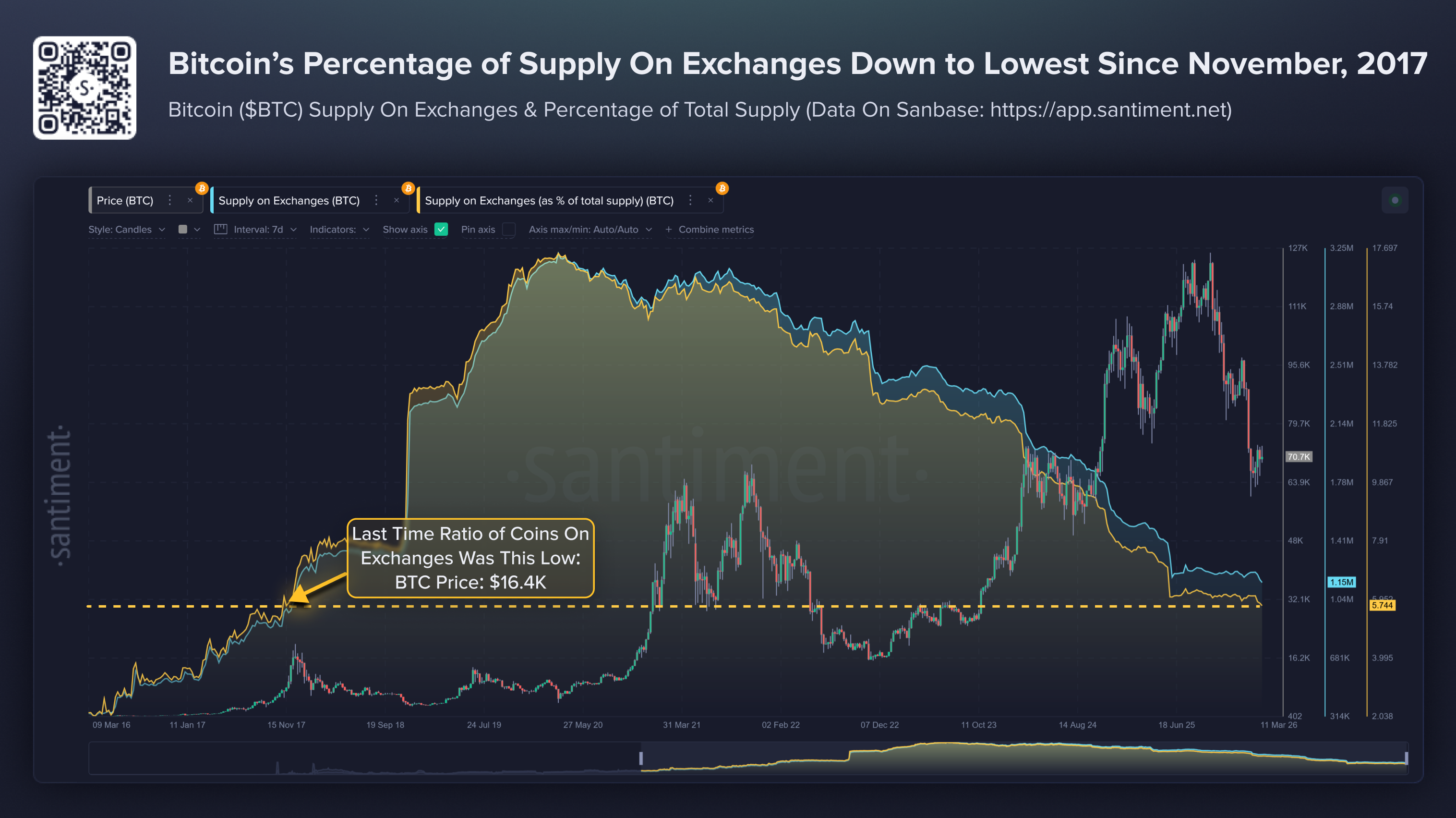 El gráfico de Santiment a continuación muestra que el porcentaje de Bitcoin en los intercambios ha caído a su nivel más bajo desde noviembre de 2017, lo que sugiere que hay menos monedas disponibles para la venta.