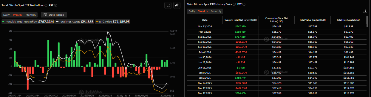 La demanda institucional de Bitcoin se mantuvo fuerte la semana pasada, indicando una creciente confianza de los inversores. Según datos de SoSoValue, los ETFs de Bitcoin al contado registraron entradas de 767.33 millones de dólares la semana pasada, tras 568.45 millones de dólares de flujos positivos la semana anterior. Esta es la tercera semana consecutiva de entradas, y si estas continúan e intensifican, el $BTC podría ver un repunte en las próximas semanas.