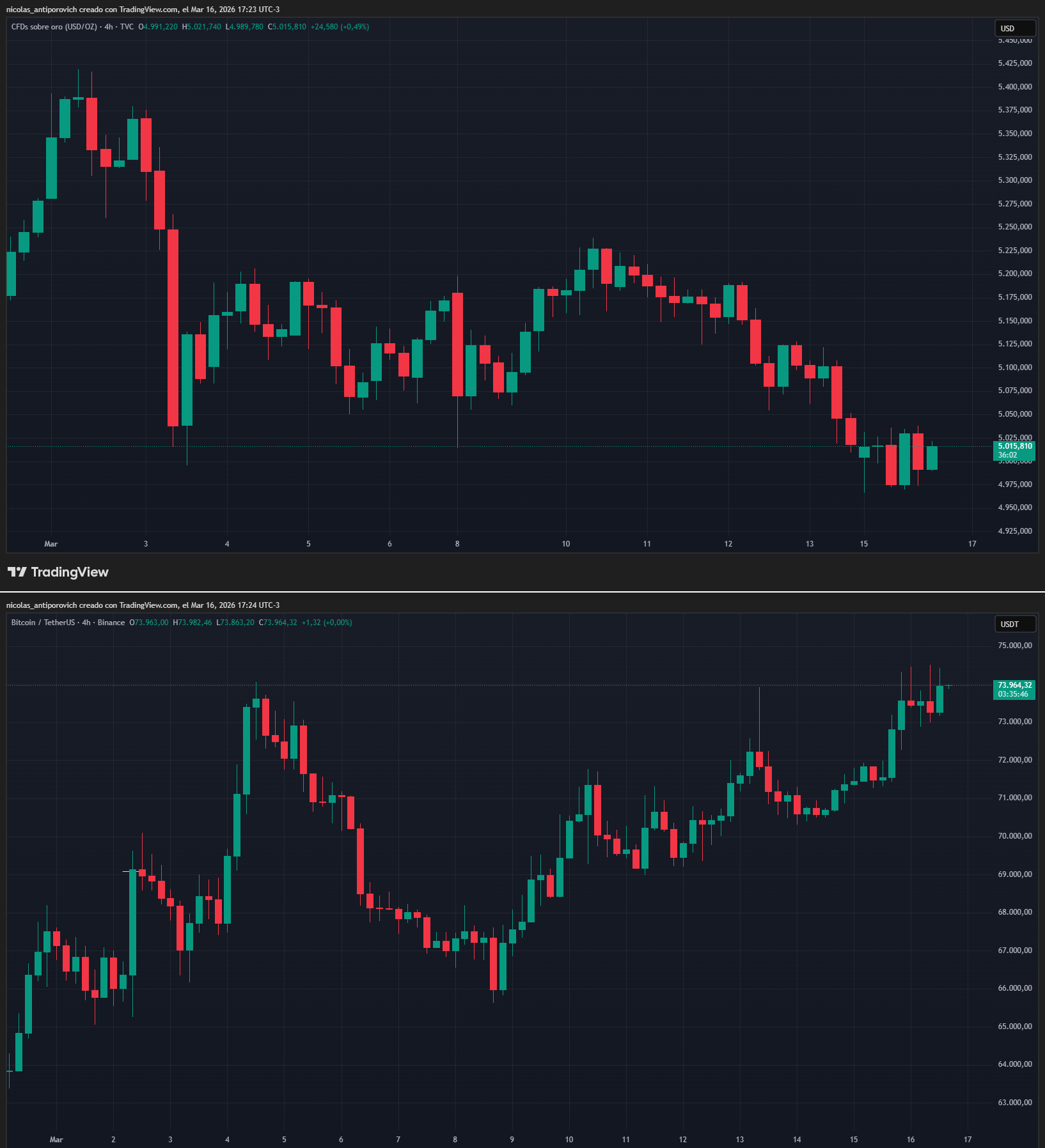 El oro y bitcoin (BTC) se están moviendo en direcciones opuestas. En este lunes 16 de marzo de 2026 la onza del metal precioso llegó a caer por debajo de los 5.000 dólares y acumula 4 días consecutivos de comportamiento bajista. Bitcoin, por su parte, lleva 8 días en verde y su precio superó hoy los 74.000 dólares.