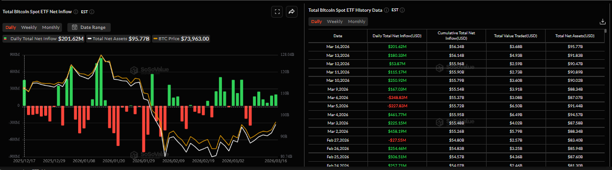 La demanda institucional de Bitcoin comenzó la semana de manera positiva. Según datos de SoSoValue, los ETF de Bitcoin al contado registraron entradas de 201,62 millones de dólares el lunes, tras una tercera semana consecutiva de entradas. Si estas entradas continúan e intensifican, el $BTC podría ver un repunte en las próximas semanas.