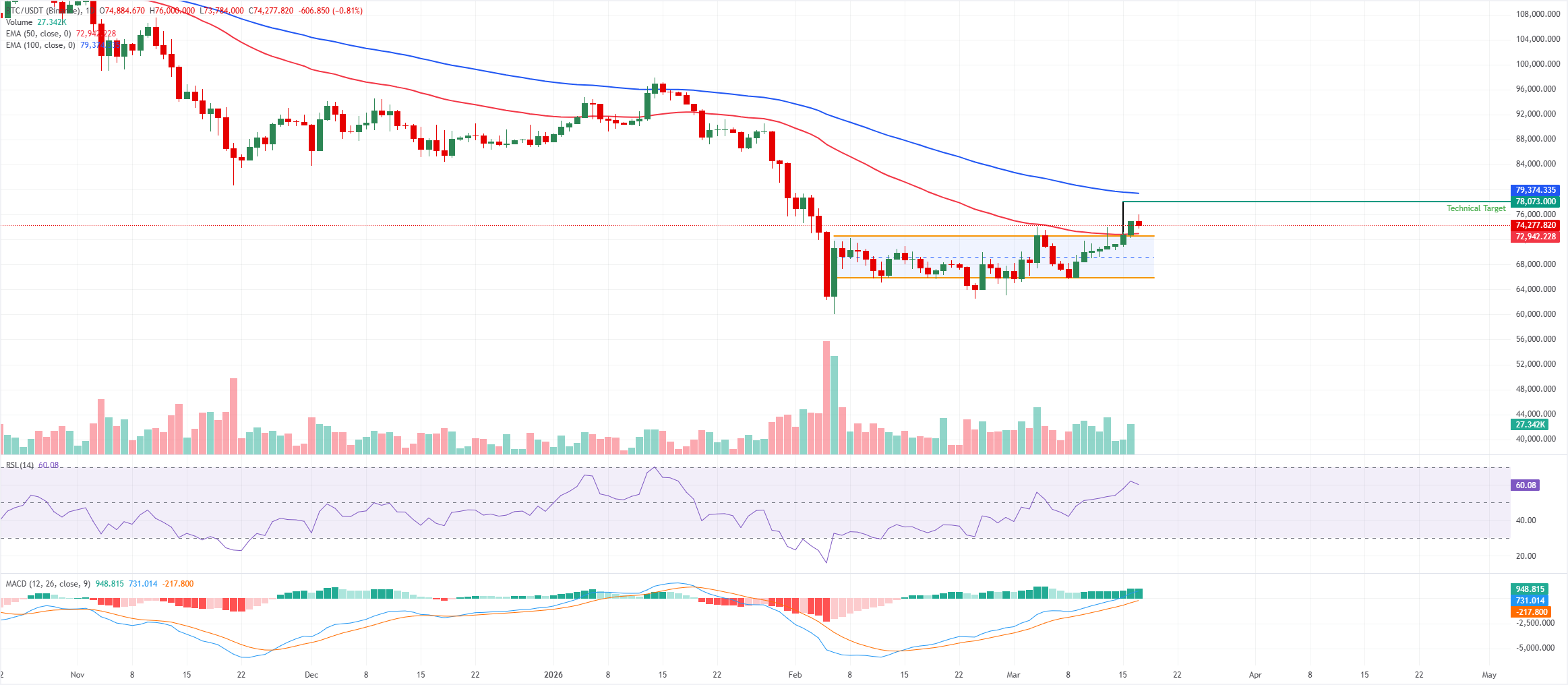 Mientras el precio se mantenga por encima de 72.900$, la estructura técnica favorece la continuación de la incipiente tendencia alcista, con retrocesos vistos como correctivos dentro de la tendencia alcista más amplia.