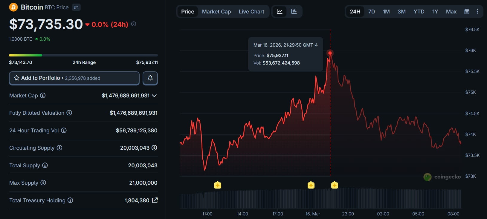 Bitcoin ($BTC) volvió a acercarse a un nivel psicológico clave, pero el mercado no logró sostener el impulso. La criptomoneda líder superó brevemente los USD $75.000 durante las primeras horas del martes, aunque poco después retrocedió por debajo de USD $74.000, en una señal de que la resistencia en esa zona sigue siendo fuerte.
