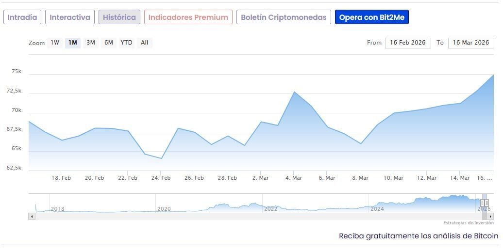 En lo que va de mes, el petróleo se ha disparado un 40%, mientras que el oro, tradicional activo refugio, ha caído un 5%. Mientras, el Bitcoinha llegado a superar este martes una barrera psicológica crucial de 75.000 dólares, acumulando ganancias de casi el 14% desde el inicio de la guerra a finales de febrero. La criptomoneda se mueve en los 74.175 dólares pasado el mediodía en Europa.