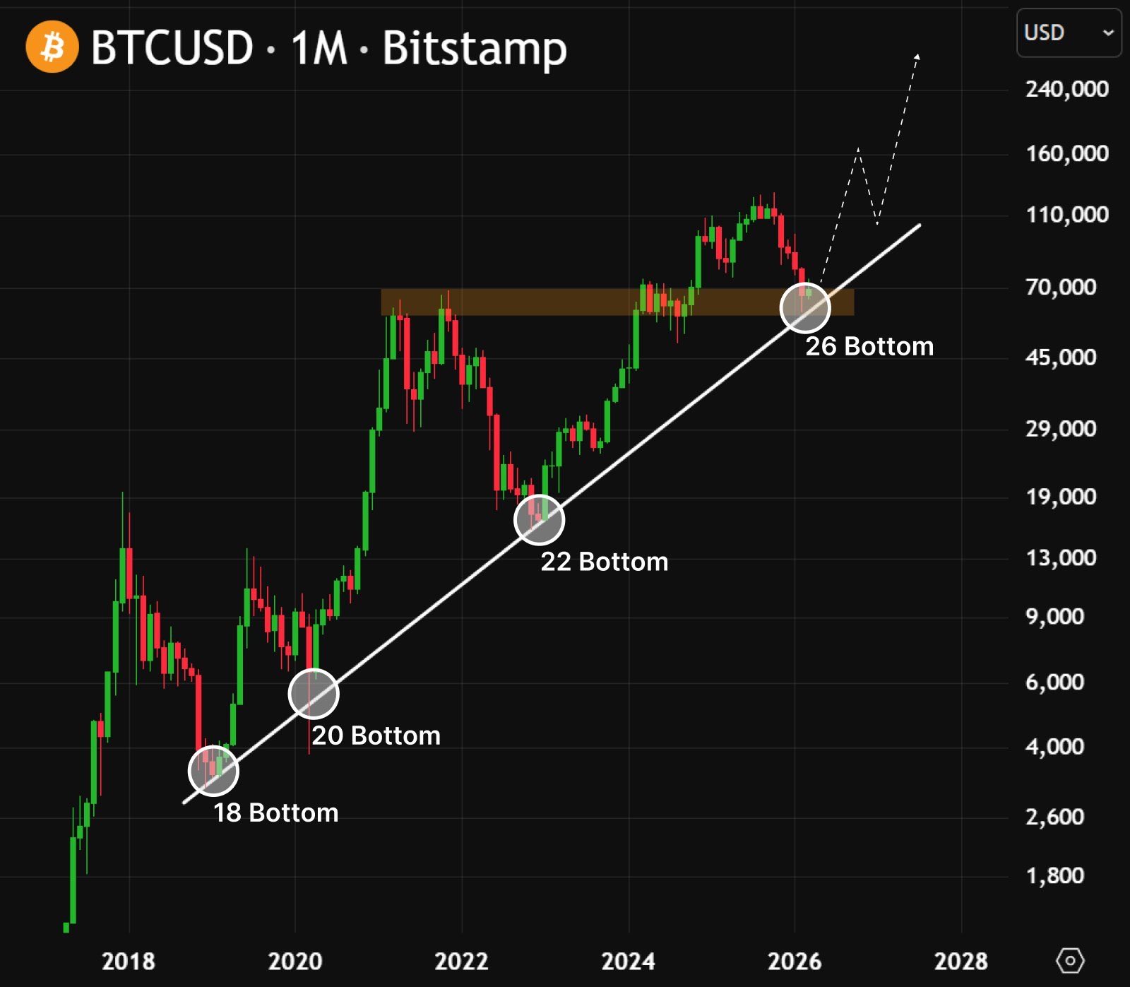 STRC ha añadido una nueva capa de demanda justo cuando Bitcoin vuelve a probar su línea de tendencia ascendente de seis años en el gráfico mensual.