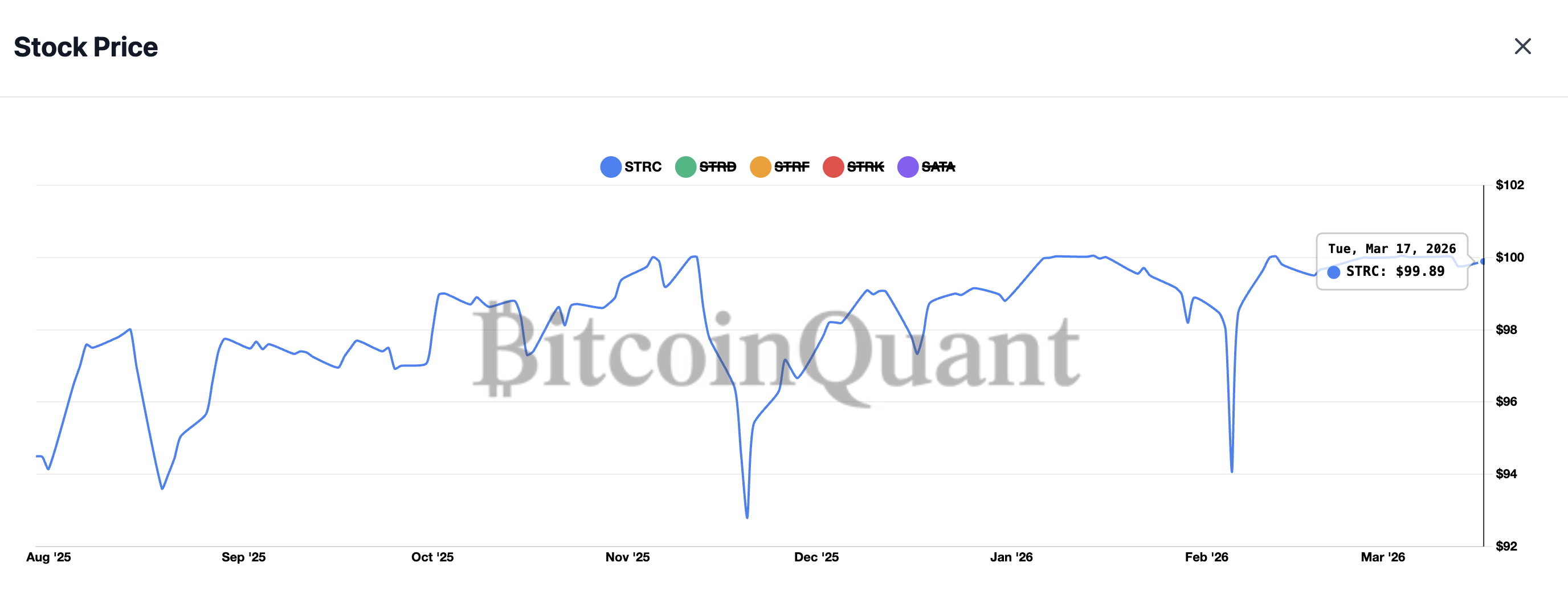 Las caídas anteriores de STRC por debajo de los USD 100 han coincidido con descensos en los precios de $BTC.