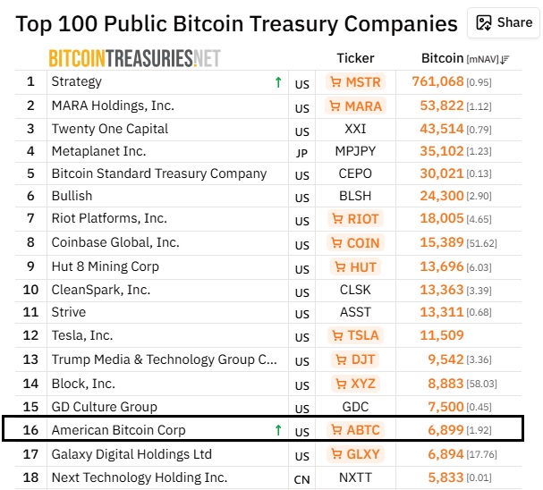 - American Bitcoin ahora posee 6.899 $BTC y se convirtió en el 16º mayor tenedor público de bitcoin.