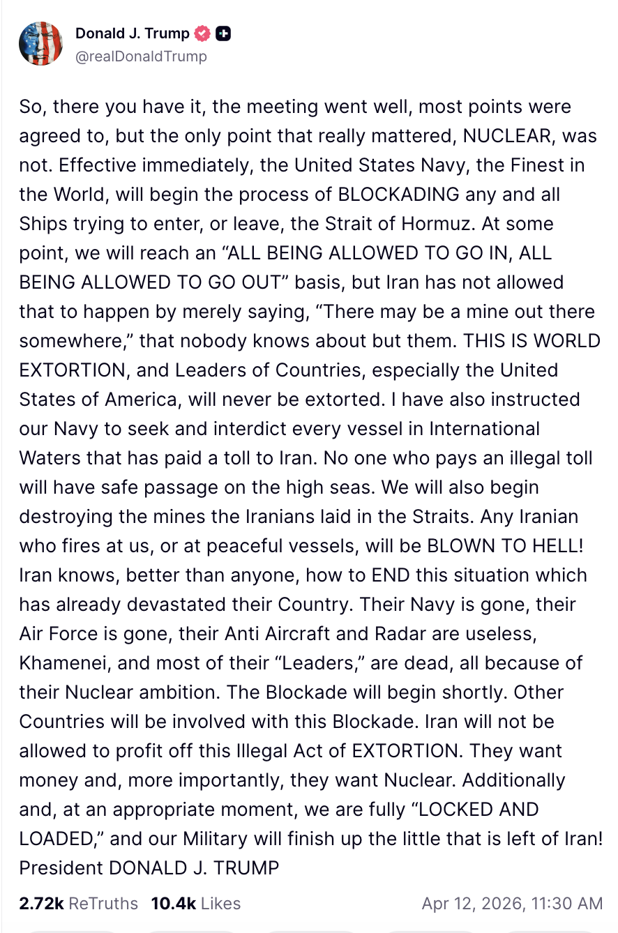 Tras el fracaso de las conversaciones de paz, el presidente de EE. UU., Donald Trump, afirmó que había ordenado al ejército estadounidense formar un bloqueo naval alrededor del estrecho de Ormuz.