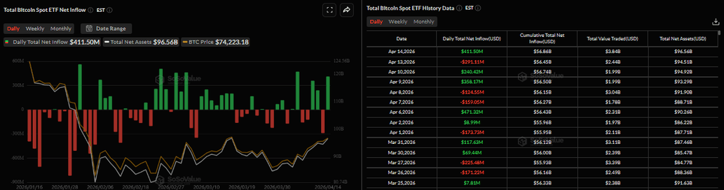 El Bitcoin ($BTC) se acerca a un nivel clave de ruptura alrededor de los 73.400$ al momento de escribir el miércoles y, si se mantiene, sugeriría un movimiento alcista. La demanda institucional respalda el precio del $BTC, ya que los fondos cotizados en bolsa (ETFs) al contado registraron entradas de más de 410 millones de dólares el martes en medio de informes que indican que las conversaciones de paz entre EE.UU. e Irán podrían reanudarse esta semana. Mientras tanto, un analista destaca que es probable que el $BTC enfrente short squeezes próximamente.