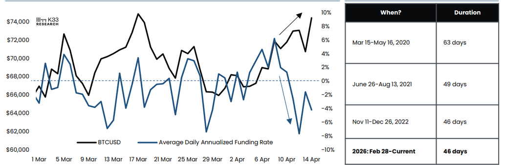 K33 Research informó que en los últimos días se han observado signos de pesimismo acelerado en lugar de estancamiento continuo. Las tasas de financiación en el exchange Binance para el par $BTC/USDT se mantuvieron negativas durante 11 intervalos consecutivos durante el fin de semana y han mostrado una aceleración limitada tras el fuerte repunte del $BTC el lunes.