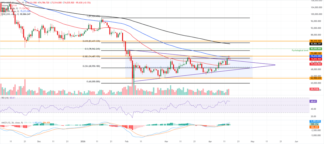 El Índice de Fuerza Relativa (RSI) en el gráfico diario se mantiene en los bajos 60, y el histograma de la Convergencia/Divergencia de Medias Móviles (MACD) permanece positivo, lo que en conjunto sugiere un momentum alcista firme mientras el $BTC se mantenga por encima del punto de ruptura cerca de los 73.400$, el límite superior del patrón de triángulo ascendente.