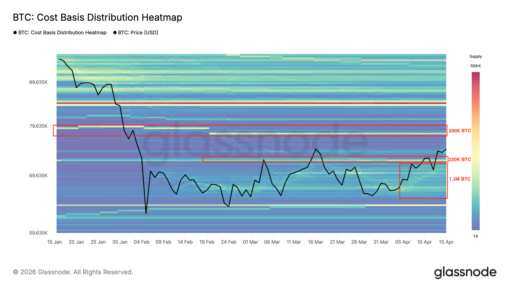 La importancia de este nivel de resistencia se ve reforzada por la distribución de la base de costo. El mapa de calor a continuación muestra que más de 200.000 $BTC fueron adquiridos por alrededor de 78.000 dólares.