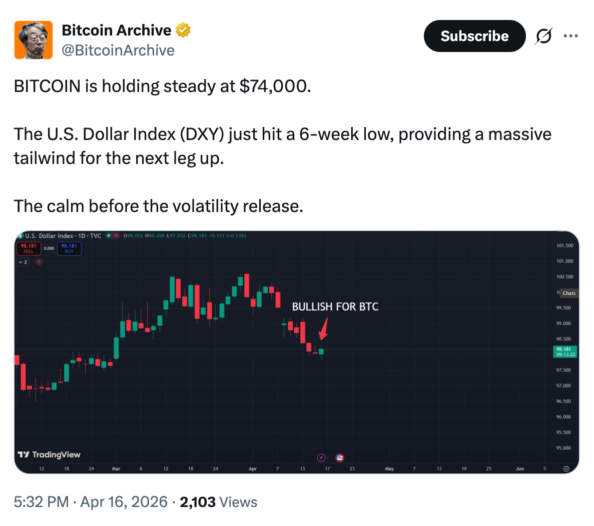 El también analista, Bitcoin Archive, se centró en la caída del índice del dólar estadounidense, afirmando que proporciona un “impulso masivo para la próxima subida” de Bitcoin.