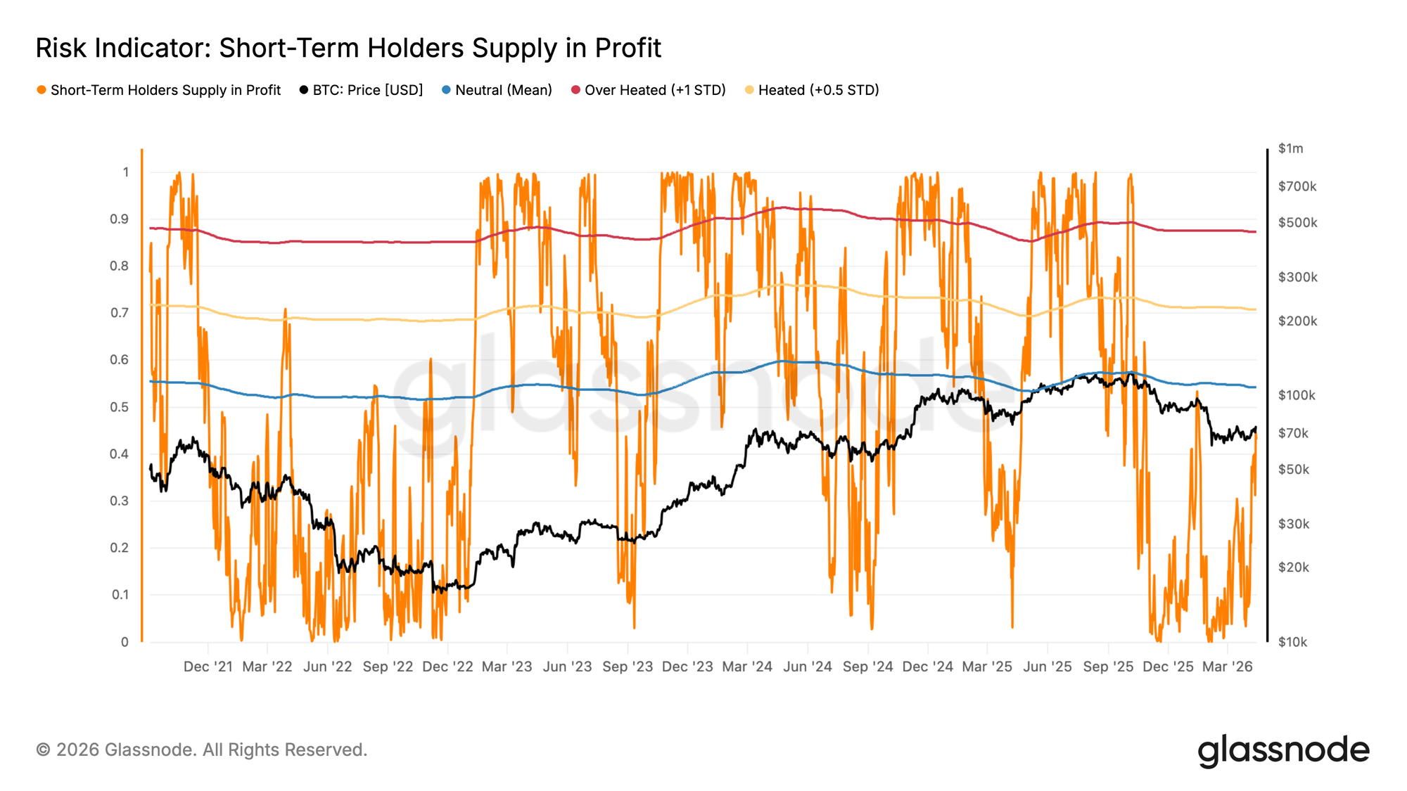 La oferta de Bitcoin de holders a corto plazo (STH) en ganancias, una medida de la proporción de monedas adquiridas recientemente que se mantienen actualmente con una ganancia no realizada, sugiere que el par $BTC/USD no ha agotado su repunte del mercado bajista, según muestran datos de Glassnode.
