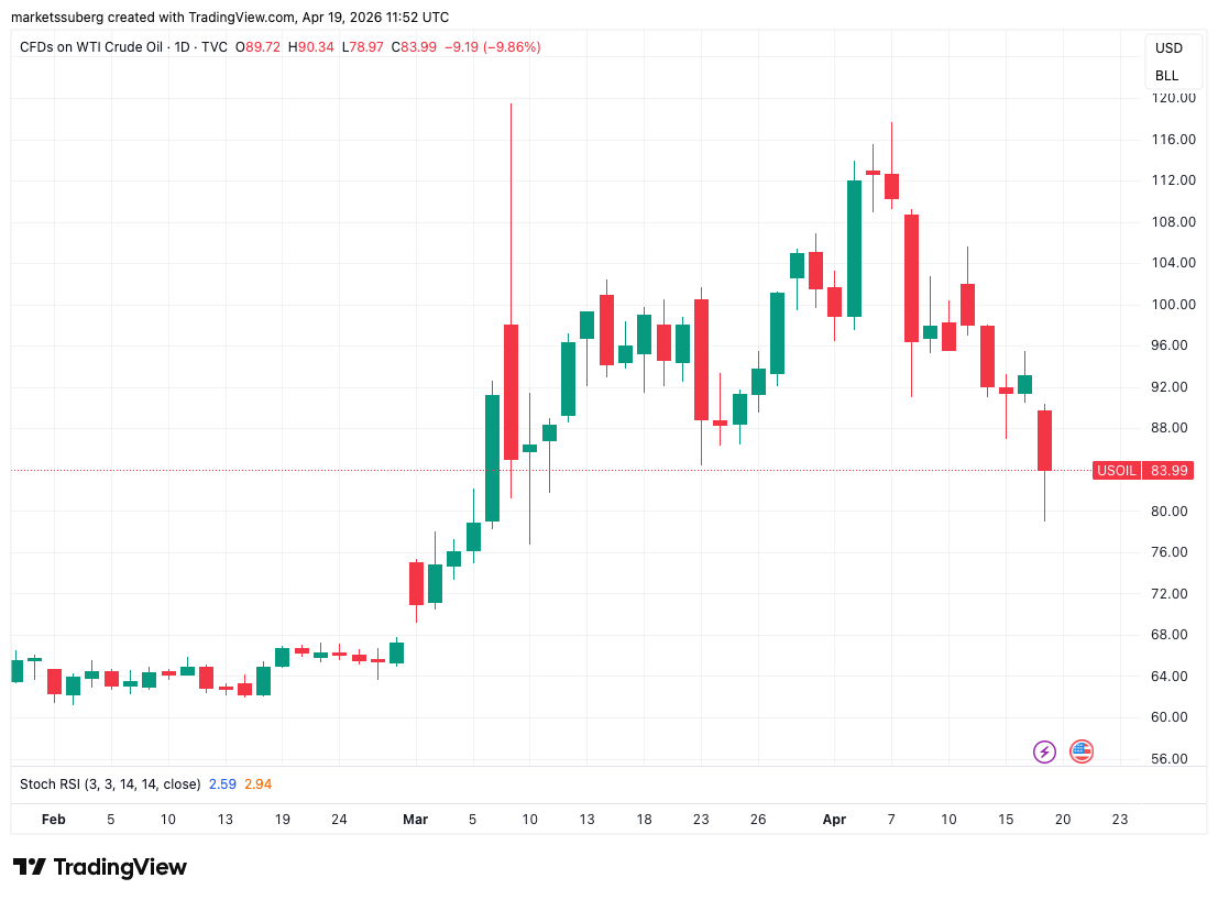 Entre los últimos desarrollos se encontraba el cierre repetido del estrecho de Hormuz, lo que centró la atención en los futuros del petróleo durante el día. La noticia de un alto el fuego había enviado el petróleo crudo WTI por debajo de 80 dólares por barril por primera vez desde el 10 de marzo.