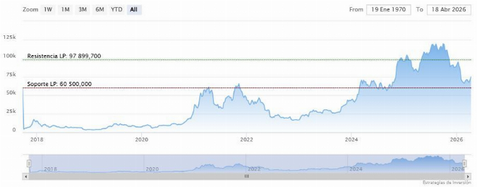 La resistencia a mediano plazo se encuentra en los 76.088 dólares. Mientras, los indicadores de Ei se muestran prácticamente alcistas.