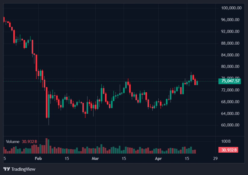 A medida que las tensiones volvieron a escalar, incluidos nuevos ataques entre ambas partes, el activo cayó aún más, hasta cerca de $73.700, antes de recuperarse de forma moderada y volver a cotizar cerca de $75.000.
