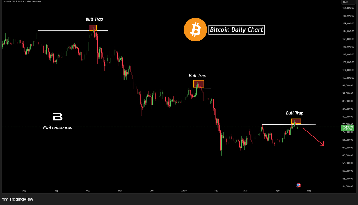El analista Bitcoinsensus dijo que la falla en romper por encima de los 78.000 dólares sugeriría que el último rally fue una "posible trampa alcista", como se vio en rupturas fallidas anteriores.