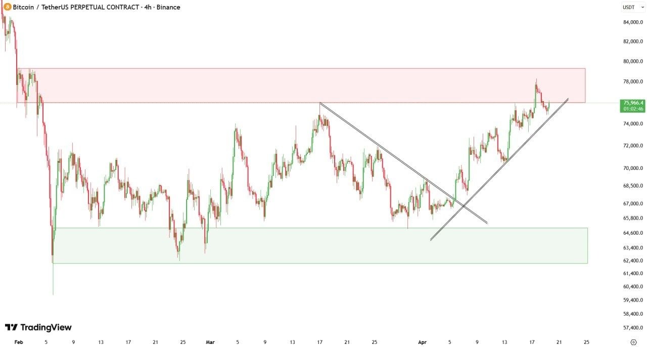 "Una ruptura limpia por encima de esta zona podría continuar el movimiento hacia nuevos máximos, mientras que un rechazo puede llevar a un retroceso hacia la región de soporte de 68K-70K."