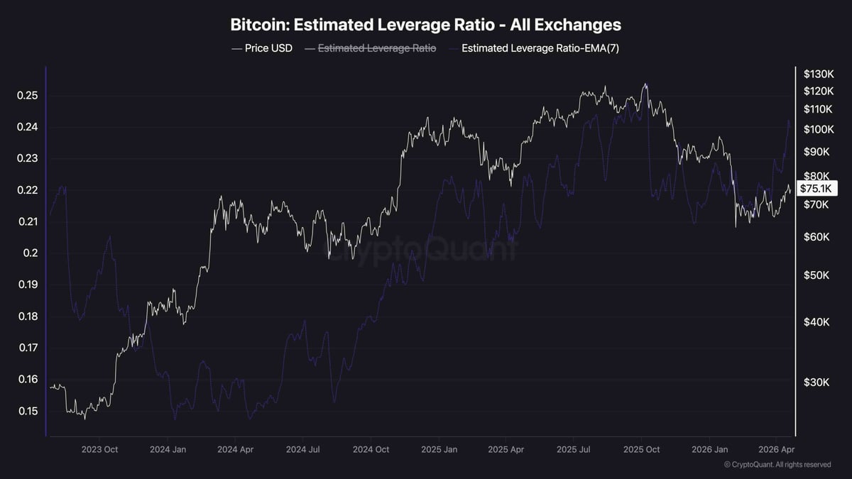 El posicionamiento se ha vuelto más frágil. El ratio estimado de apalancamiento en los exchanges ha subido con fuerza, y su media móvil exponencial de siete días se acerca a 0,24, cerca de niveles vistos por última vez a finales del mercado alcista de 2025, cuando Bitcoin cotizaba entre $110.000 y $125.000.