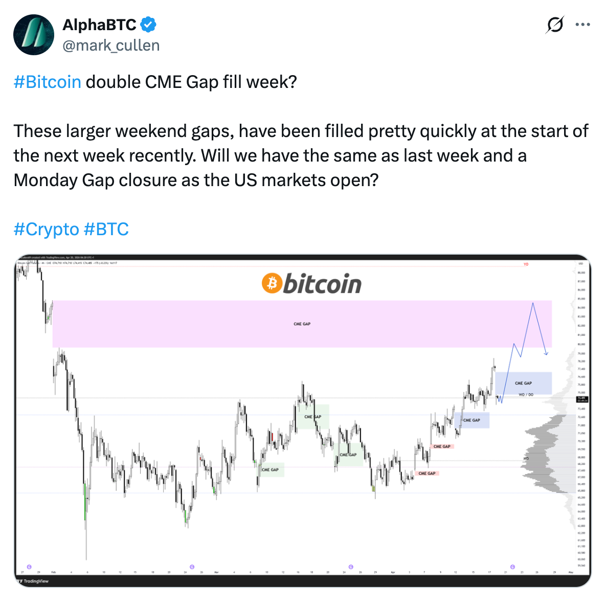 El analista, AlphaBTC, dijo que el par $BTC/USD podría subir más para cerrar la brecha del CME en los 84.000 dólares, que se creó a principios de febrero.