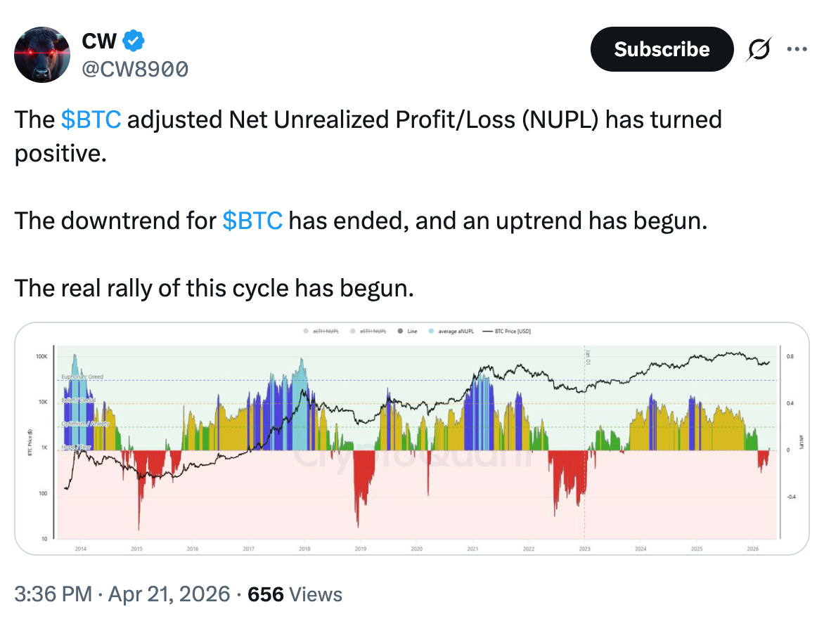 Esto sugiere que la tendencia bajista de Bitcoin ha terminado, y que el "repunte real de este ciclo ha comenzado", dijo CW8900 en otra publicación de X.
