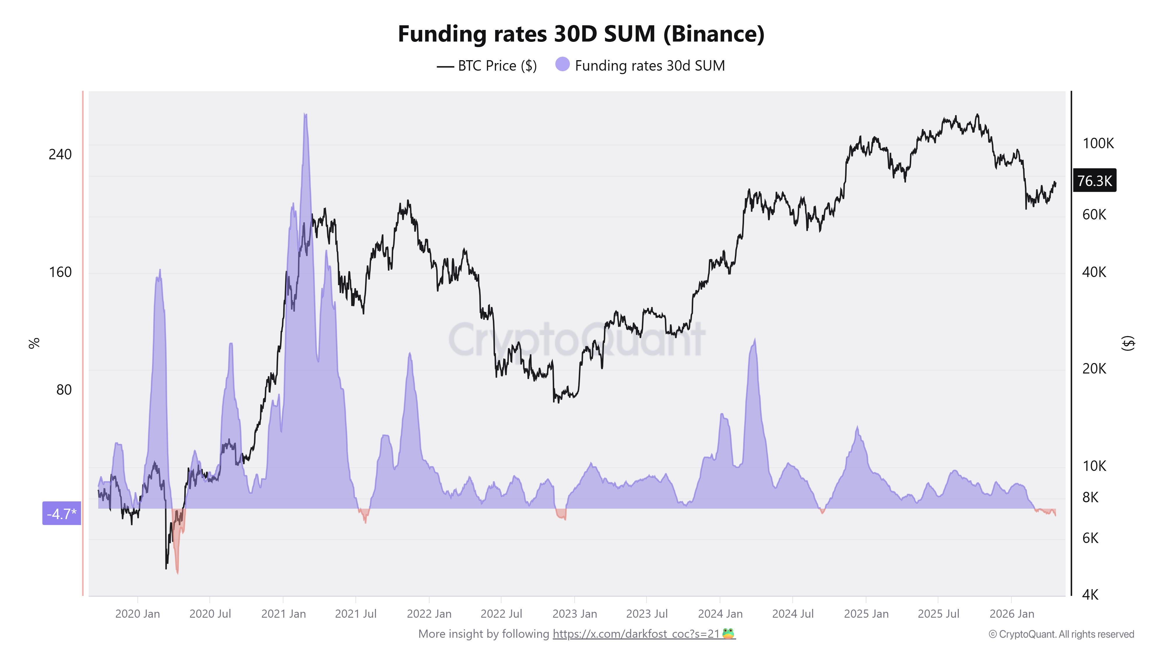 Los datos muestran que el posicionamiento del mercado de derivados no ha seguido el ritmo de la tendencia alcista de los precios. El analista de criptomonedas Darkfost realizó un seguimiento de la tasa de financiación acumulada a 30 días, que agrega la financiación a lo largo del tiempo para revelar un posicionamiento sostenido. La métrica se sitúa cerca del -4,5%, lo que refleja un sesgo bajista prolongado en contra del movimiento actual.