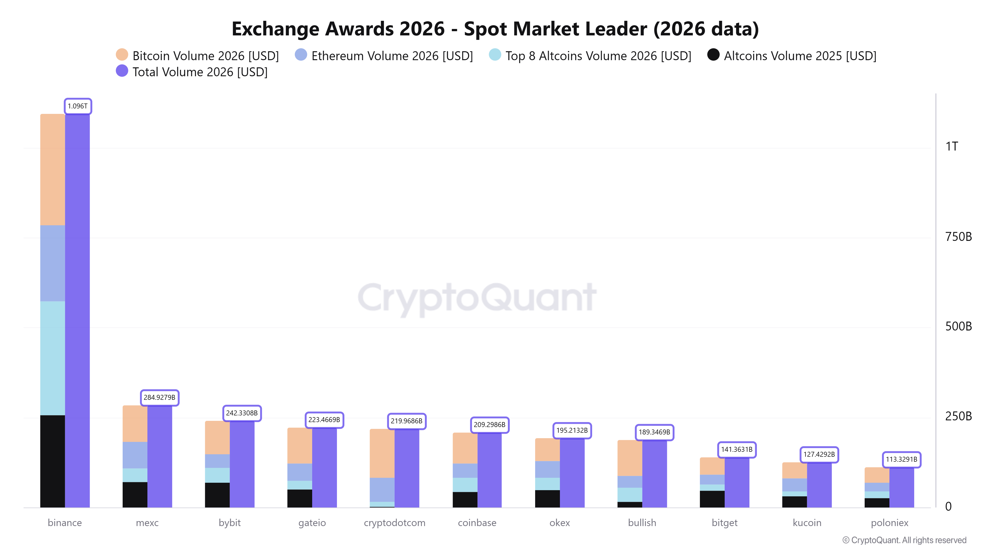 Los volúmenes de los exchanges añaden más contexto. El analista de mercado Maartunn señaló que Binance ha procesado USD 1,09 billones en volumen de trading en 2026 en 112 días. Otras plataformas se quedan atrás, con MEXC en USD 284.000 millones, Bybit en USD 242.000 millones y Crypto.com en USD 219.000 millones.