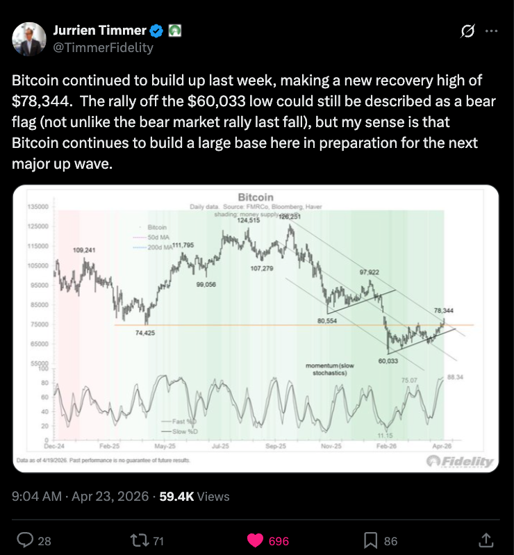 Jurrien Timmer, director de macroeconomía global de Fidelity, observó que el repunte de $BTC desde el mínimo de USD 60.033 “aún podría describirse como una bandera bajista (no muy diferente al repunte del mercado bajista del otoño pasado)”, pero Timmer sugirió que el resultado podría no seguir el patrón del gráfico.