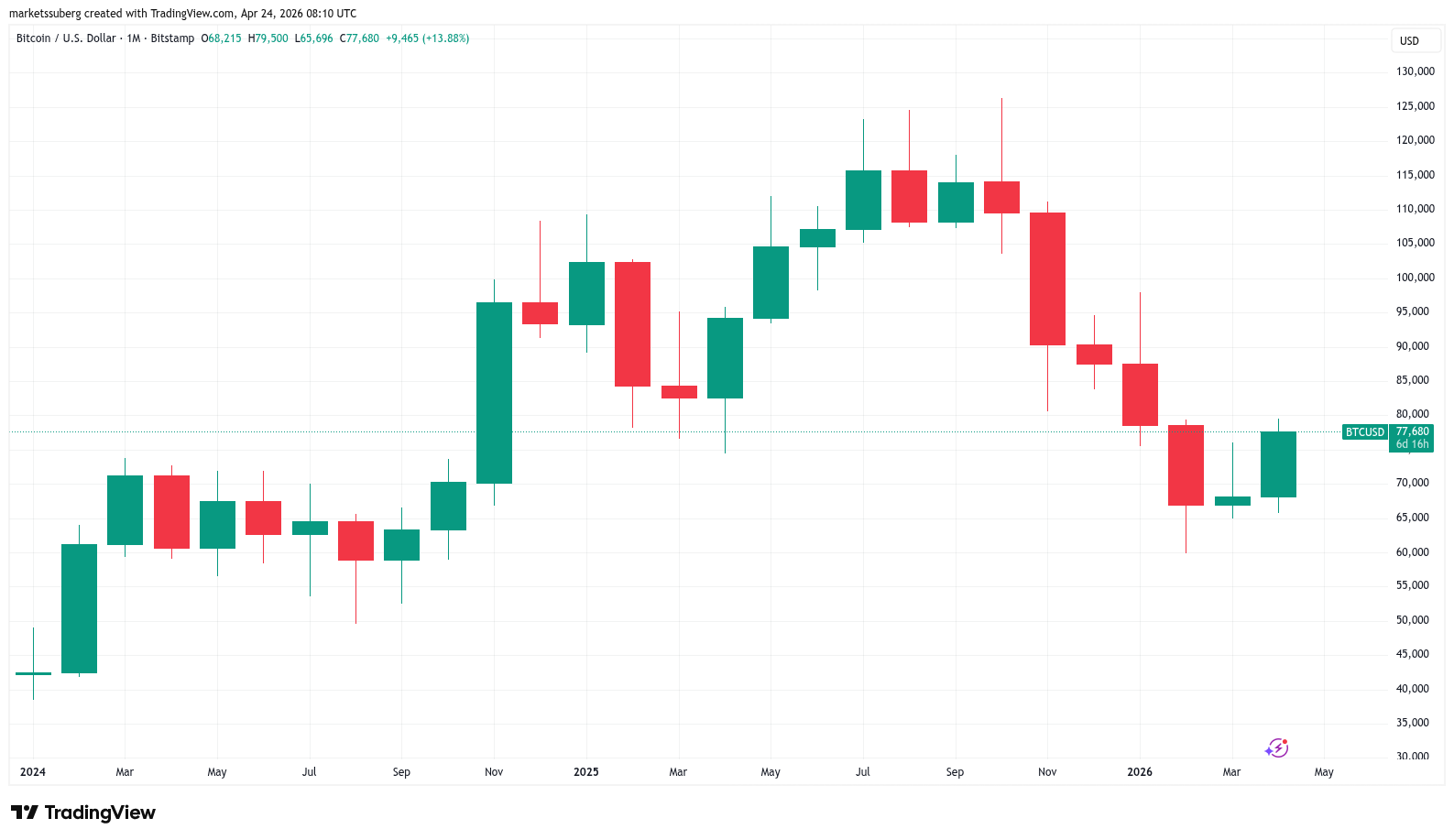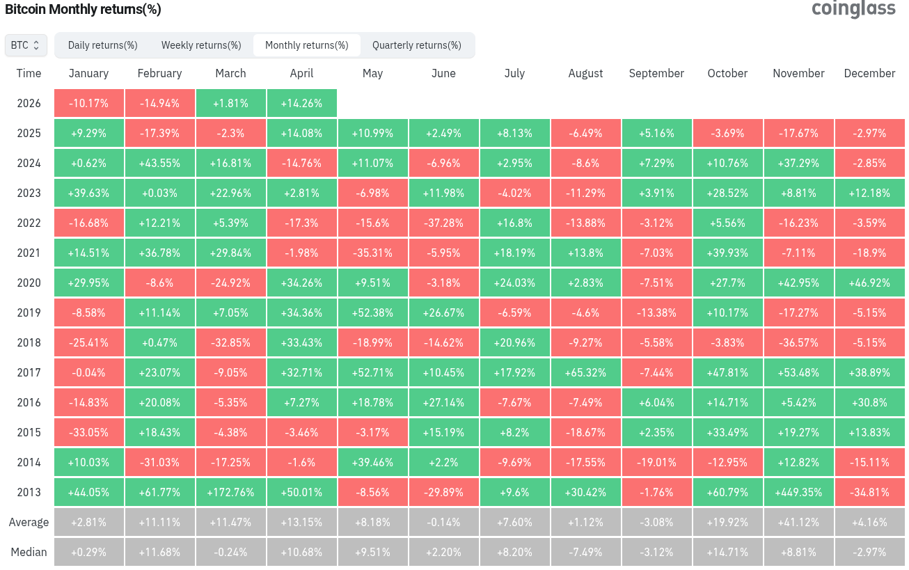 CoinGlass muestra que si el cierre mensual coincide con los niveles actuales, el par sellará su mes más alcista desde noviembre de 2024. Actualmente, las ganancias de abril de este año están ligeramente por encima de las de 2025, cuando Bitcoin terminó un 14,1% más alto.