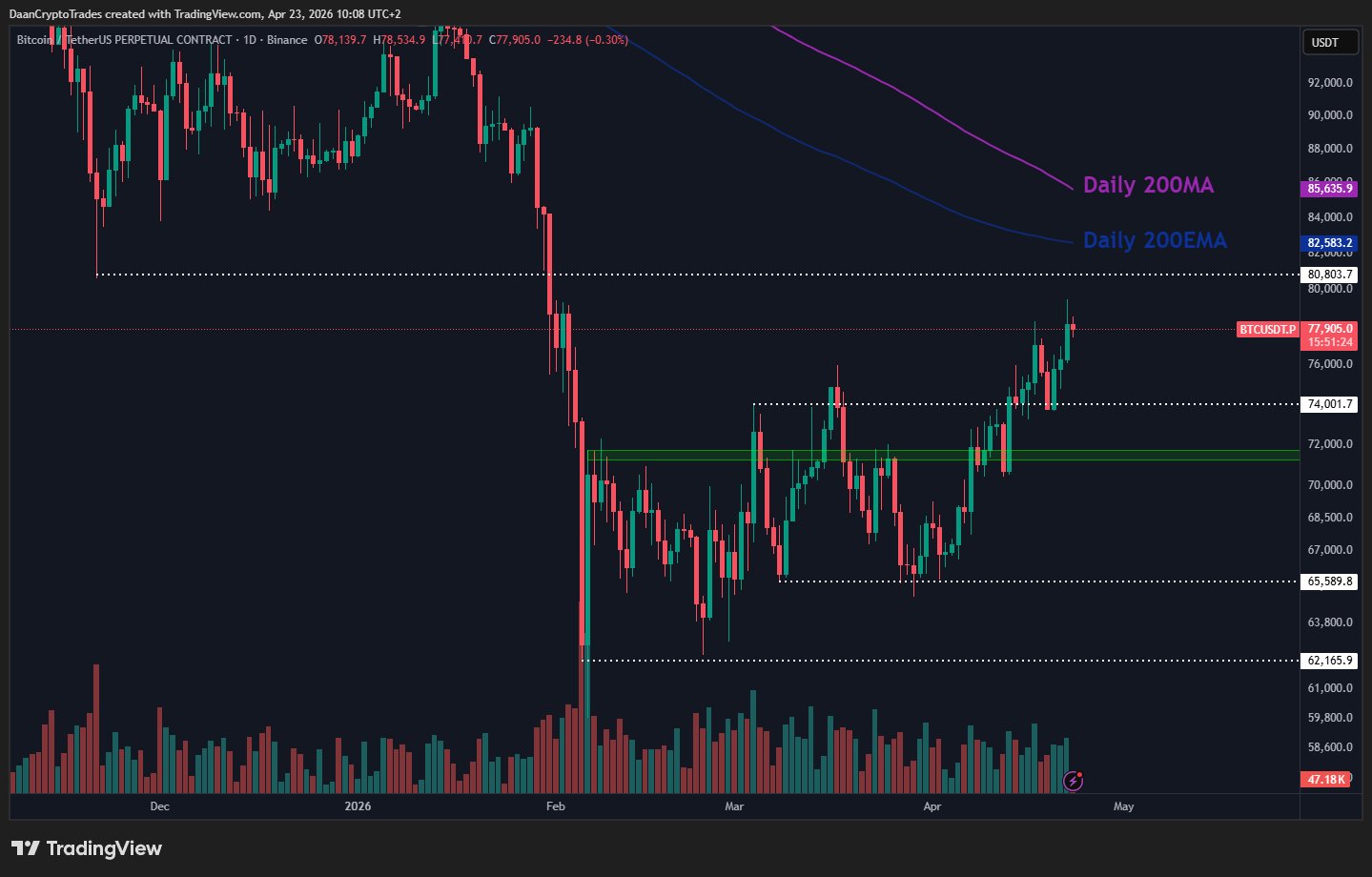 “$BTC ha estado en una tendencia alcista durante abril. Pero se acerca a algunos niveles importantes de marco temporal alto. Especialmente por encima del área de los 80.000 dólares es donde los alcistas necesitarían abrirse paso para revertir esto en el marco temporal alto”, resumió el trader, Daan Crypto Trades, el jueves.