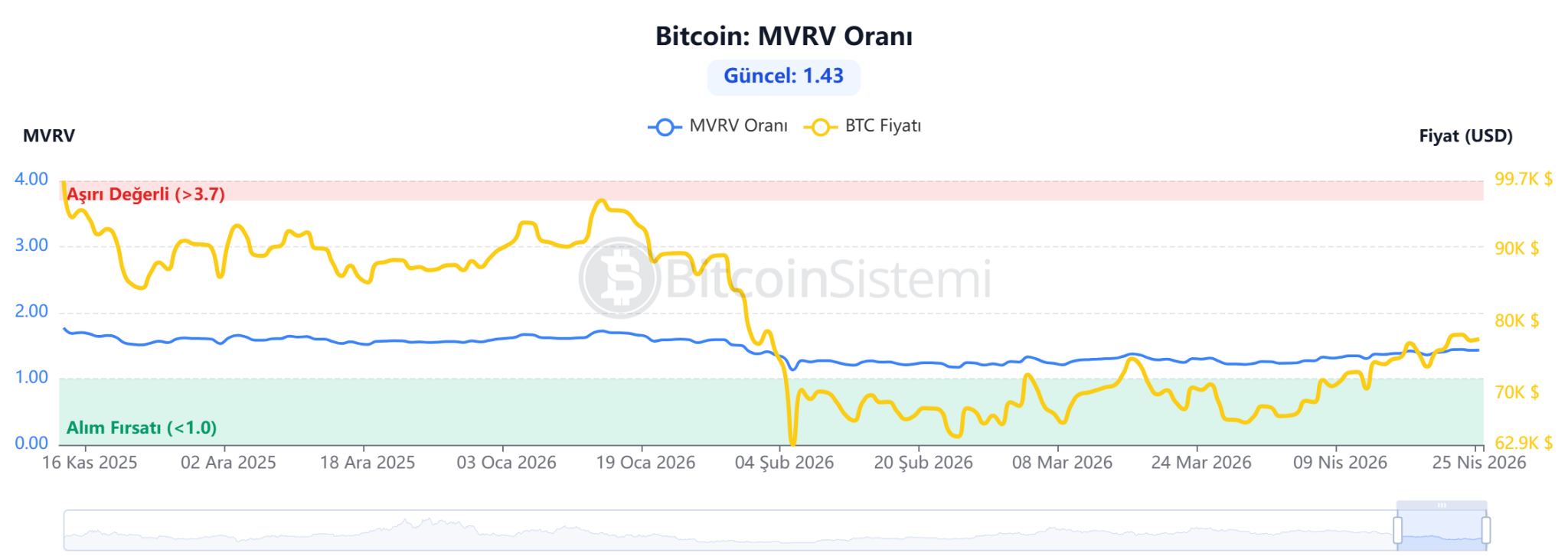 Otro indicador importante, el ratio MVRV, se sitúa en 1,43. Este valor indica que el mercado aún no ha entrado en la zona de sobrevaloración, pero también se está alejando de sus mínimos. Los analistas señalan que los periodos en los que el MVRV se encuentra entre 1 y 2 generalmente corresponden a fases de equilibrio y de crecimiento gradual. Esto sugiere que Bitcoin no se encuentra actualmente ni en una burbuja ni en un mínimo, sino que está atravesando una fase de crecimiento a medio plazo.
