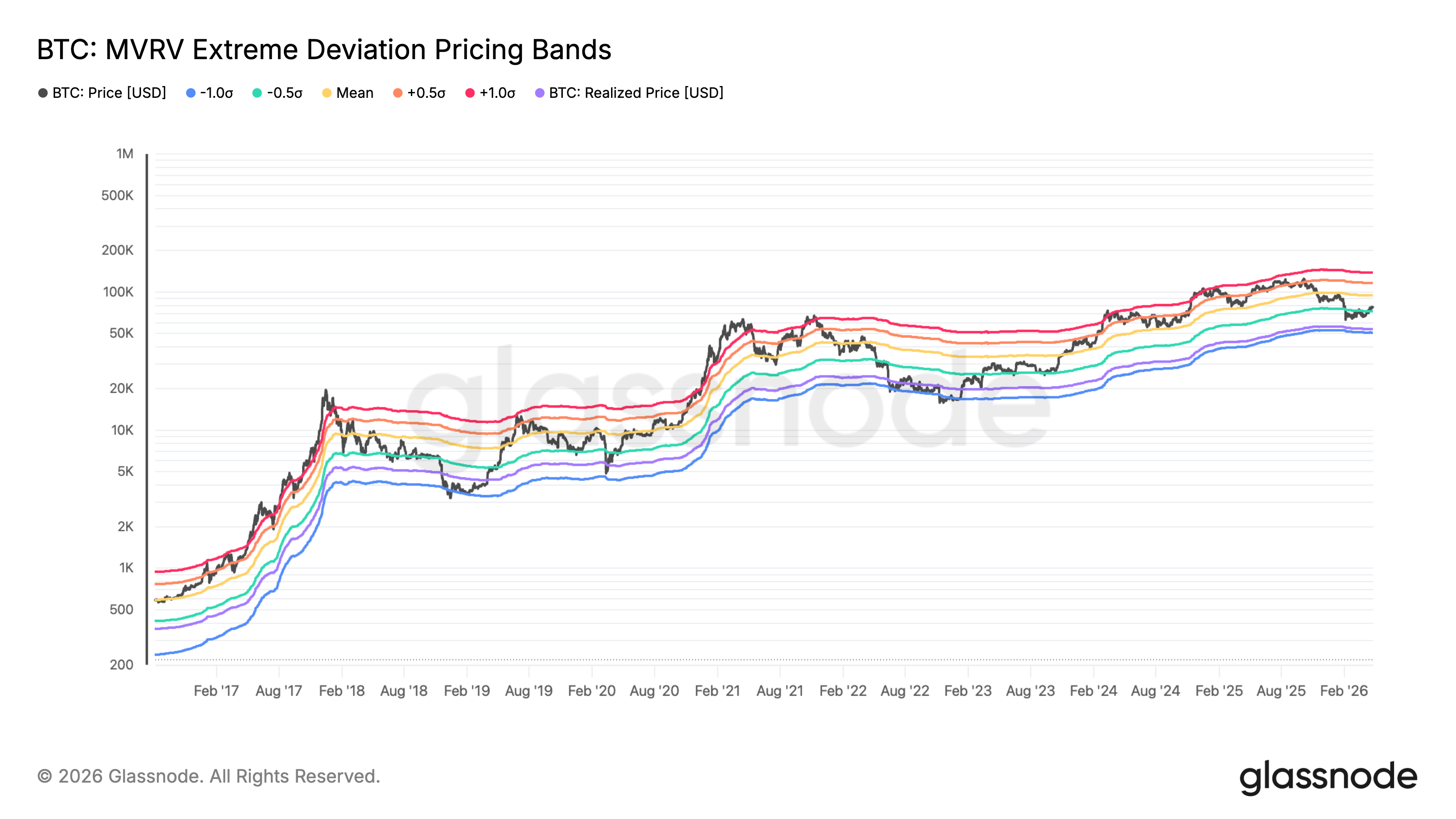 Cuando $BTC sube de nuevo por encima de una banda de desviación inferior, el mercado ya no está operando con un descuento profundo respecto a su valor realizado, lo que a menudo abre espacio para un movimiento hacia la siguiente banda.