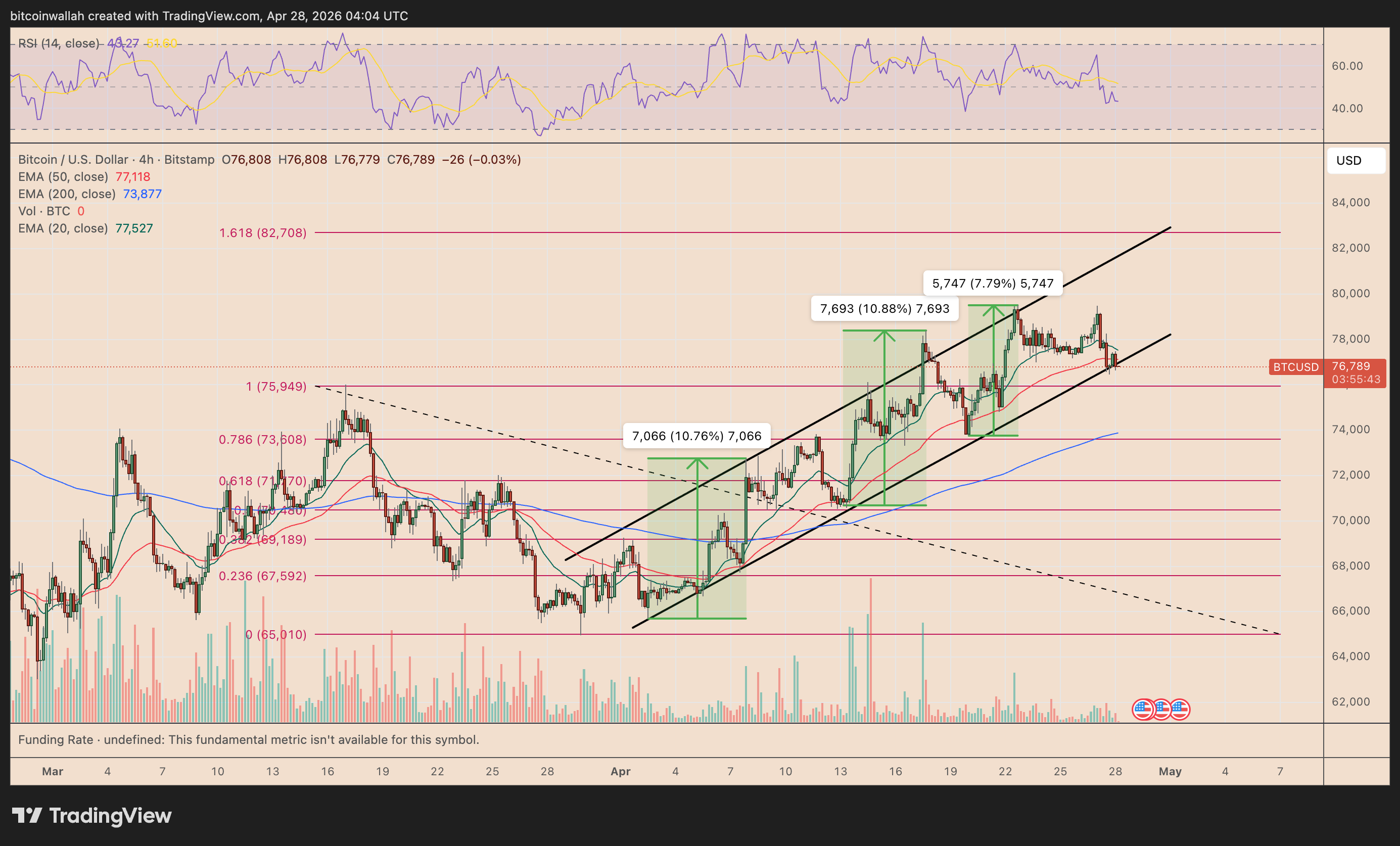 Por el contrario, una ruptura corre el riesgo de que el precio de $BTC caiga hacia los 73.600 dólares, un nivel que se alinea con la línea de Fibonacci de 0.786 y la EMA de 200-4H (azul).