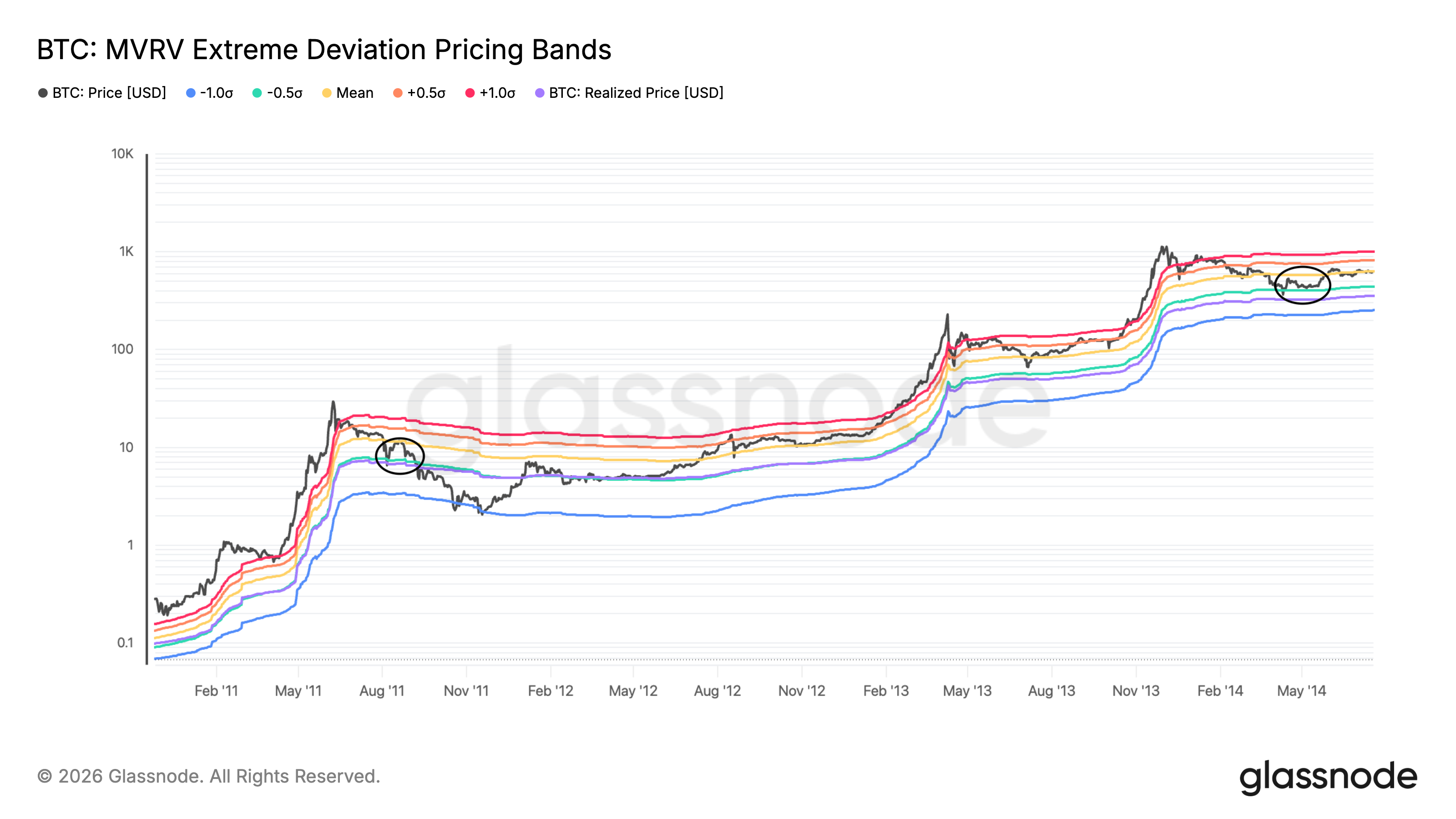 Bandas de desviación de precios extremas de MVRV de $BTC vs. precio. Fuente: Glassnode