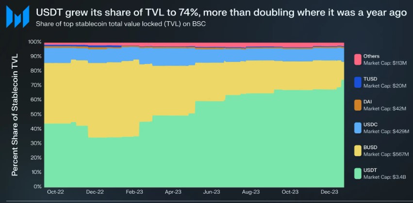 A pesar de una disminución en el promedio diario de direcciones activas y nuevas direcciones únicas, principalmente debido a que los usuarios exploran cadenas alternativas como opBNB, la actividad en cadena de BSC se mantuvo sólida. El ecosistema de monedas estables del protocolo, dominado por el USDT de Tether, alcanzó un valor total bloqueado (TVL) de 4.600 millones de dólares en el cuarto trimestre, lo que muestra un aumento intertrimestral del 33 % en el TVL de las finanzas descentralizadas (DeFi).