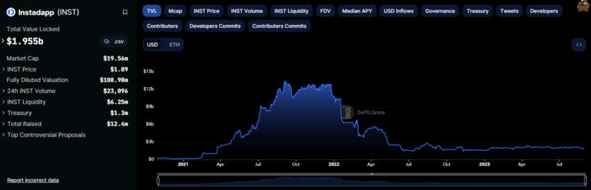 El protocolo tiene su propio token de gobernanza llamado INST, pero también se ha desplomado 95% desde su pico durante el bear market de criptomonedas.