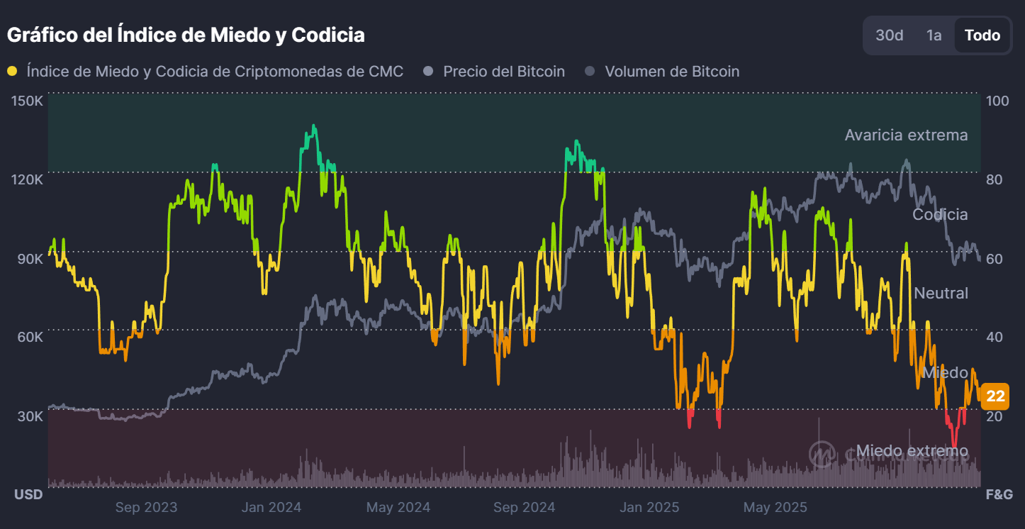 En paralelo, el Índice de Miedo y Codicia se sitúa al momento del análisis en torno a los 22 puntos, manteniéndose en zona de miedo. Esta lectura continúa reflejando un entorno de cautela y aporta señales consistentes con un mercado que tiende a desarrollar episodios de volatilidad más contenida, al menos en el corto plazo.